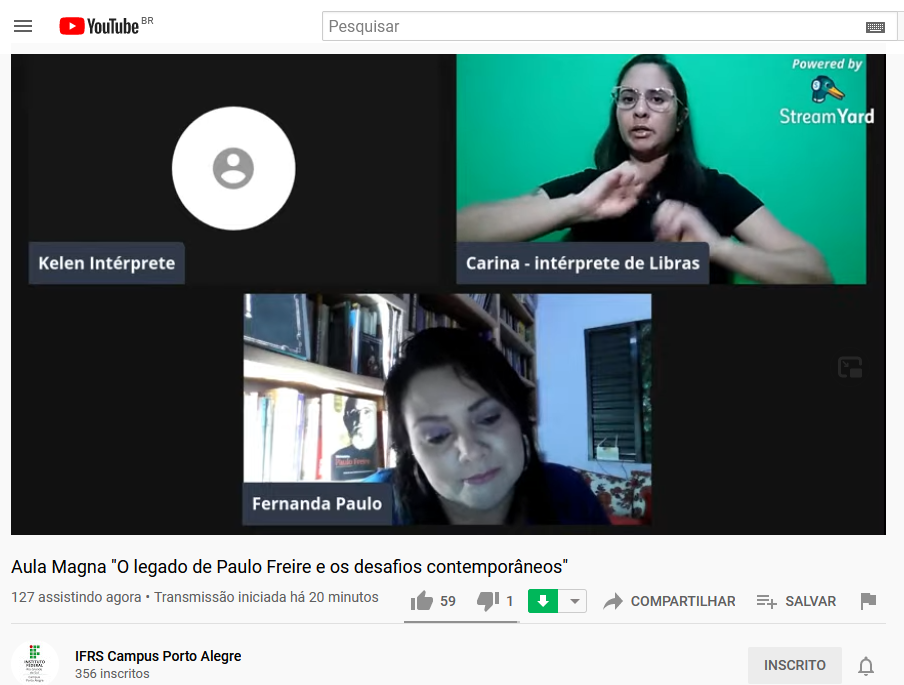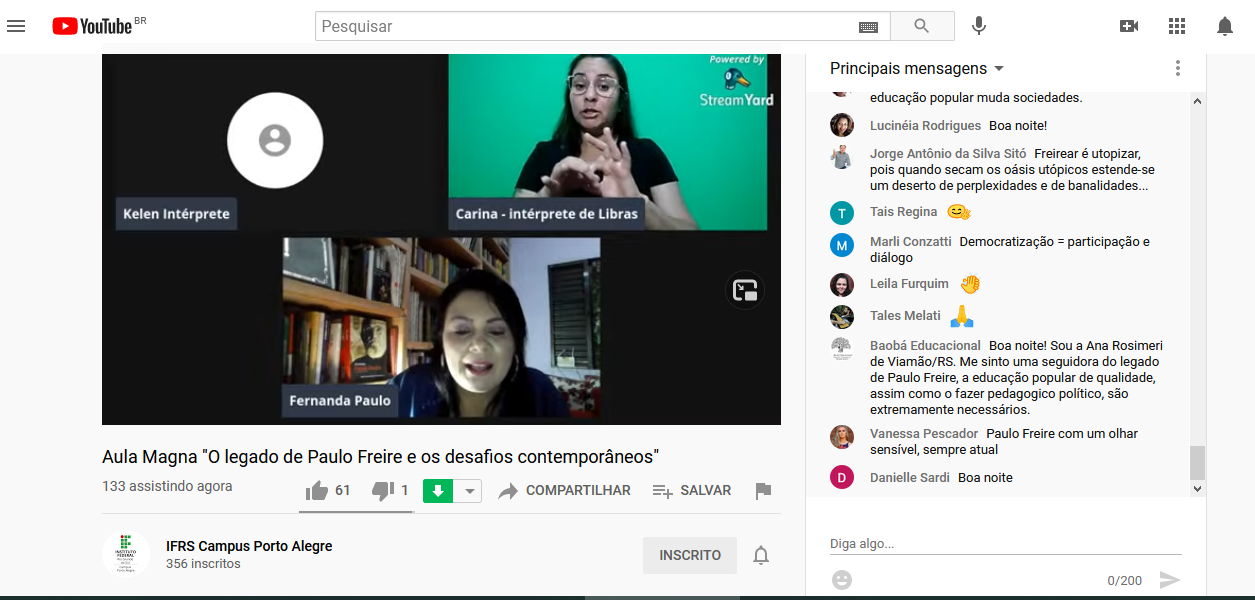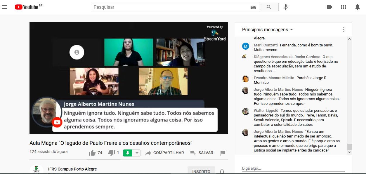 O evento ao vivo foi transmitido on-line pelo canal do Campus Porto Alegre no YouTube, e contabilizou um público de 133 pessoas assistindo simultaneamente. O vídeo já está disponível para acesso no canal. A atividade marcou a abertura do segundo ciclo de Atividades Pedagógicas Não Presenciais (APNP) do Campus Porto Alegre e da série de ações integradas de Ensino, Pesquisa e Extensão que serão promovidas pelo Campus ao longo de 2021 com a temática Vida e Obra de Paulo Freire - Conectando Saberes, em alusão ao centenário de nascimento do educador brasileiro, celebrado neste ano.