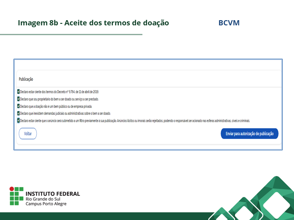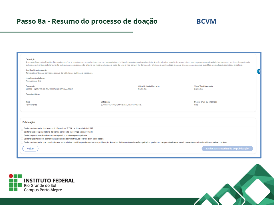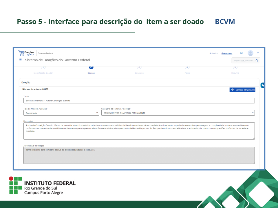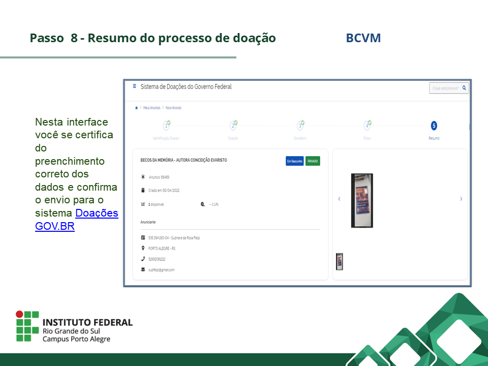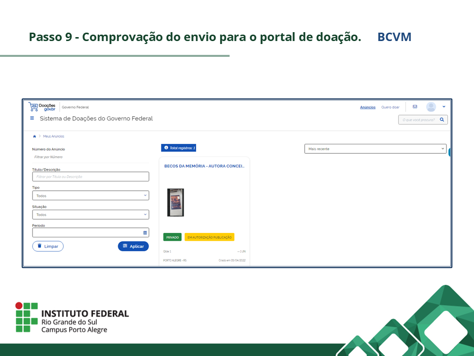 Desse modo, todas as doações de itens bibliográficos para nossa biblioteca deverão ser lançadas nesse portal, pois os livros são considerados material permanente pela gestão pública federal. Tal ação exige do doador um cadastramento prévio, e você poderá direcionar a doação a um órgão específico. A doação ficará disponível por 10 dias no portal para a instituição selecionada. Decorrido esse período, qualquer instituição federal poderá manifestar interesse pelos itens disponibilizados no portal Doações GOV.BR.