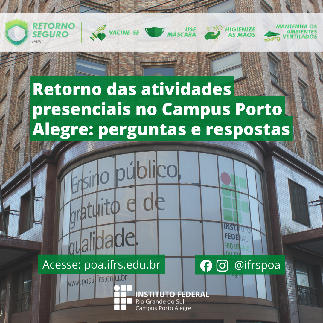 Servidores e estudantes que manifestarem sintomas gripais devem procurar atendimento médico de imediato. Ofício Circular nº 01/2023 - Suspensão do Plano de Contingência do IFRS Confira aqui e os principais protocolos de segurança e prevenção à Covid-19 adotados pelo Campus Porto Alegre. Tem mais dúvidas ou sugestões? Envie e-mail para: Este endereço de email está sendo protegido...
