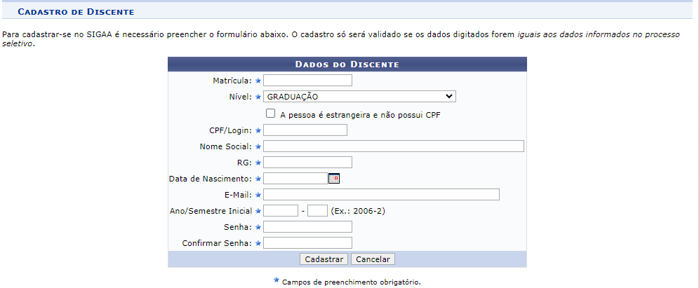 A senha definida pelo aluno nesta etapa de cadastro no sistema SIGAA será a mesma senha que será utilizada cada vez que se autenticar no sistema.