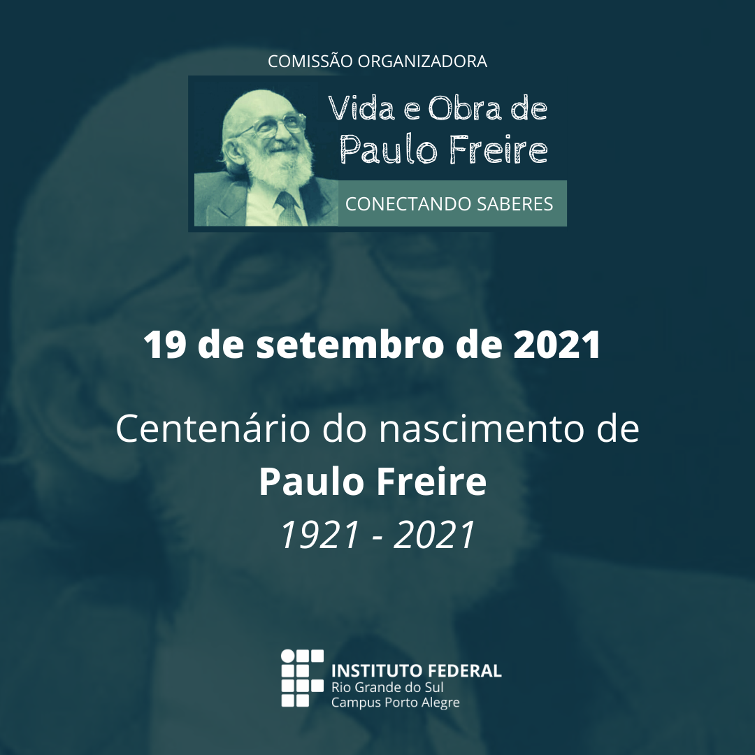 Ao longo deste ano, o Campus Porto Alegre do IFRS vem realizando, por meio da Comissão Vida e Obra de Paulo Freire - Conectando Saberes, uma série de ações integradas alusivas aos 100 anos de Freire. Como forma de marcar a data de hoje, indicamos os links dos vídeos de algumas das atividades já realizadas pela comissão, e de uma que acontecerá no próximo dia 22/09 - lembrando que haverá mais ações na temática até o final do ano. Confira: