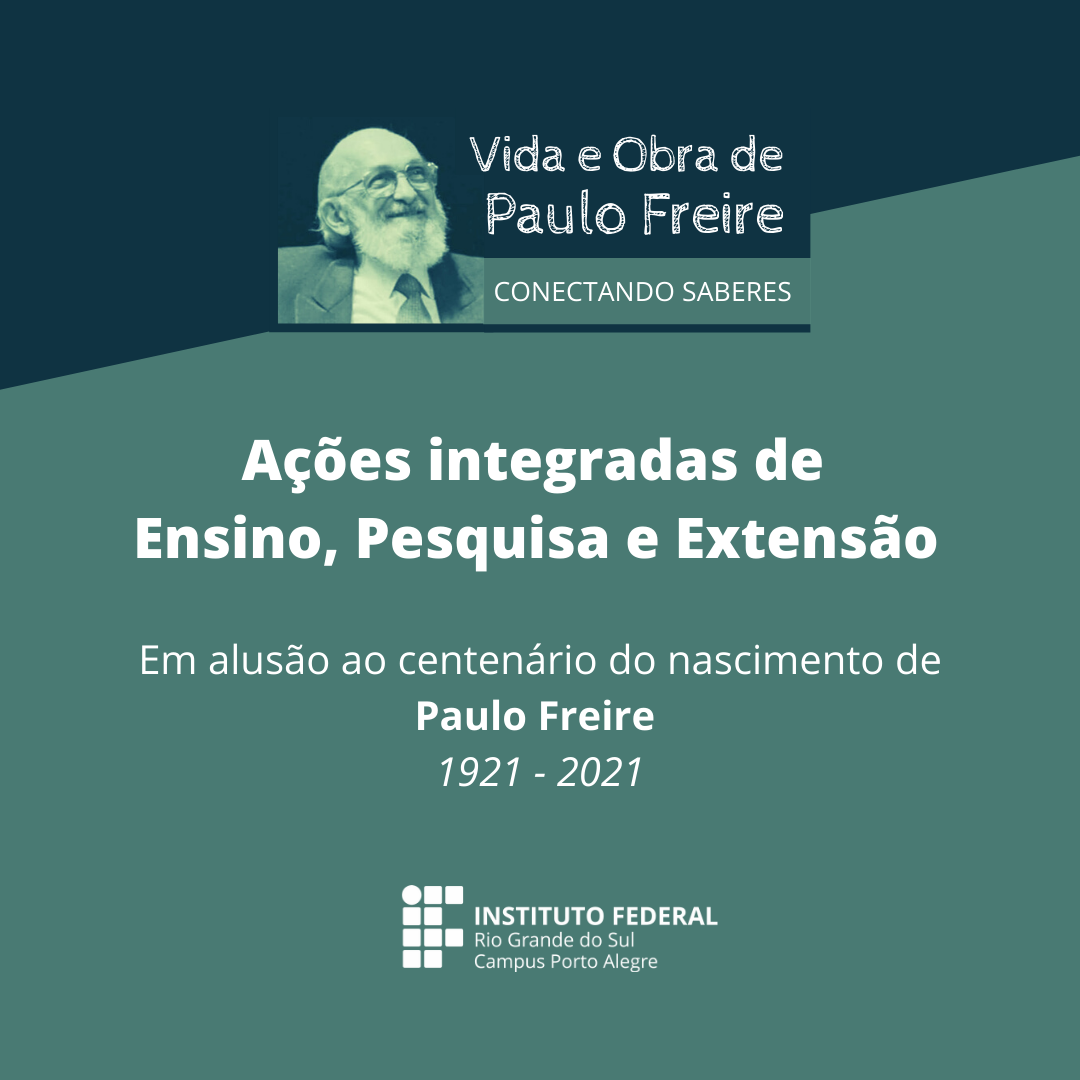 Em 19 de setembro de 2021 celebra-se o centenário de nascimento do educador, pedagogo e filósofo brasileiro Paulo Freire - o Patrono da Educação Brasileira. Para marcar a data, as equipes da Diretoria de Ensino, Pesquisa e Extensão do IFRS - Campus Porto Alegre promoverão uma série de ações indissociáveis ao longo do ano, com a temática Vida e Obra de Paulo Freire - Conectando saberes. As atividades são coordenadas por uma comissão que já está trabalhando na concepção das propostas.