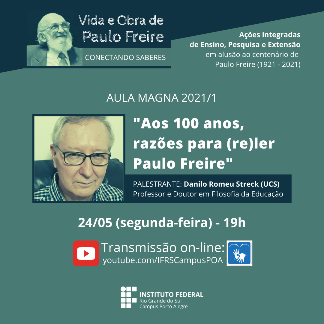O Campus Porto Alegre do IFRS promove na segunda-feira, 24 de maio de 2021, às 19h, a Aula Magna do semestre 2021/1, intitulada "Aos 100 anos, razões para (re)ler Paulo Freire", ministrada pelo professor Dr. Danilo Romeu Streck, da Universidade de Caxias do Sul (UCS). A mediação será da professora Dra. Aline Grunewald Nichele, representante da Comissão para Organização da Formação Inicial e Continuada em Educação do Campus Porto Alegre. O evento será transmitido on-line pelo canal do Campus Porto Alegre no YouTube, com acesso aberto a todos os interessados e acessível em Libras. em A atividade integra ainda a série de ações integradas de Ensino, Pesquisa e Extensão do IFRS - Campus Porto Alegre com a temática Vida e Obra de Paulo Freire - Conectando Saberes, em alusão ao centenário do educador brasileiro, celebrado neste ano.