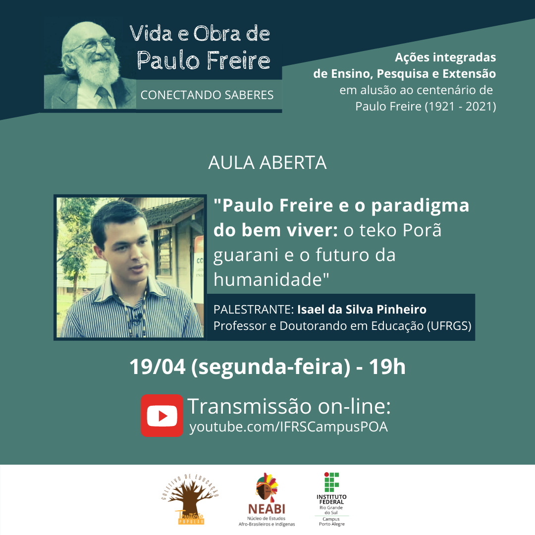 No dia 19 de abril, data em que no Brasil se celebra o Dia dos Povos Indígenas, o Núcleo de Estudos Afro-Brasileiros e Indígenas (NEABI) do IFRS - Campus Porto Alegre e o Coletivo de Educação Território Popular promovem, às 19h, a Aula Aberta virtual intitulada "Paulo Freire e o paradigma do bem viver: o teko Porã guarani e o futuro da humanidade", ministrada pelo professor Me. Isael da Silva Pinheiro. O evento será transmitido on-line pelo canal do Campus POA no YouTube. A atividade faz parte da série de ações integradas de Ensino, Pesquisa e Extensão do IFRS - Campus Porto Alegre com a temática Vida e Obra de Paulo Freire - Conectando Saberes, em alusão ao centenário do educador brasileiro, celebrado neste ano.