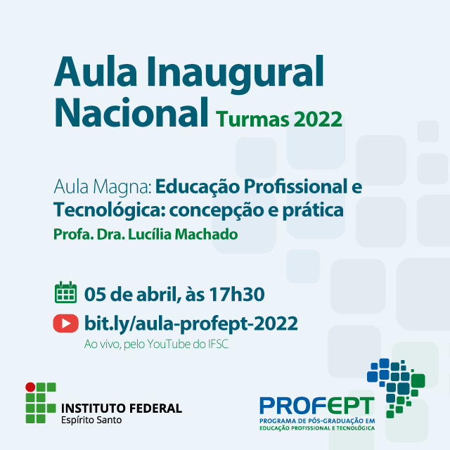 Está marcada para o dia 5 de abril a aula inaugural do Programa de Pós-Graduação em Educação Profissional e Tecnológica em Rede Nacional (ProfEPT). A aula magna terá o tema "Educação Profissional e Tecnológica: concepção e prática" e será proferida pela Profa. Dra. Lucília Machado, para as turmas ingressantes. O evento será transmitido a partir das 17h30 pelo Canal do Instituto Federal de Santa Catarina (IFSC) no YouTube e também é aberto a toda a comunidade acadêmica, egressos e interessados no tema.