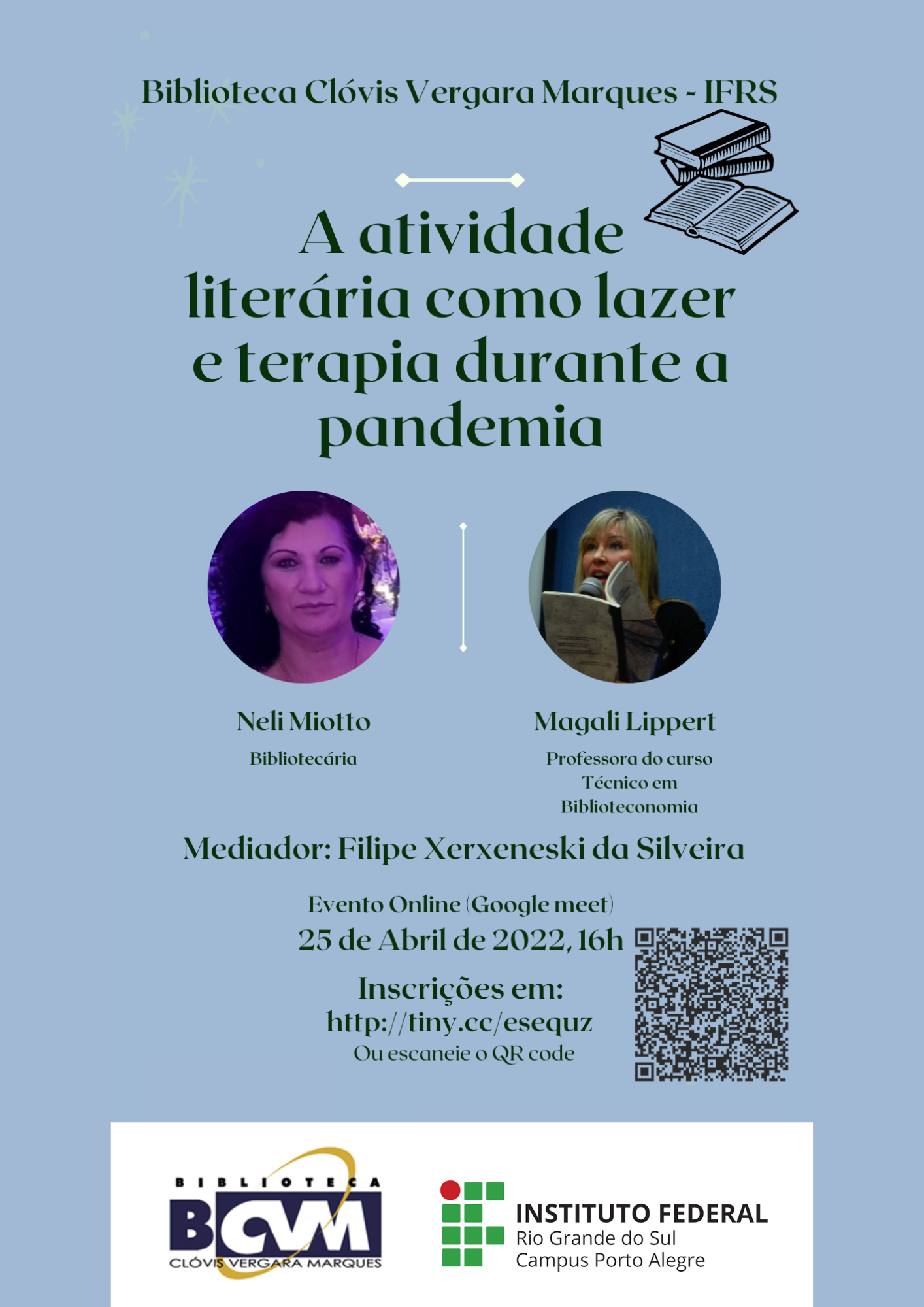 Com o propósito de celebrar o Dia Mundial do Livro e dos Direitos Autorais, comemorado em 23 de abril, a Biblioteca Clóvis Vergara Marques (BCVM) do IFRS - Campus Porto Alegre promove no dia 25 de abril o evento on-line "A atividade literária como lazer e terapia durante a pandemia", às 16h, através da plataforma Google Meet. As inscrições, gratuitas, devem ser feitas pelo link: http://tiny.cc/esequz. O evento terá como palestrantes convidadas a professora Magali Lippert e a bibliotecária Neli Miotto, e mediação do bibliotecário do Campus, Filipe Xerxeneski da Silveira.