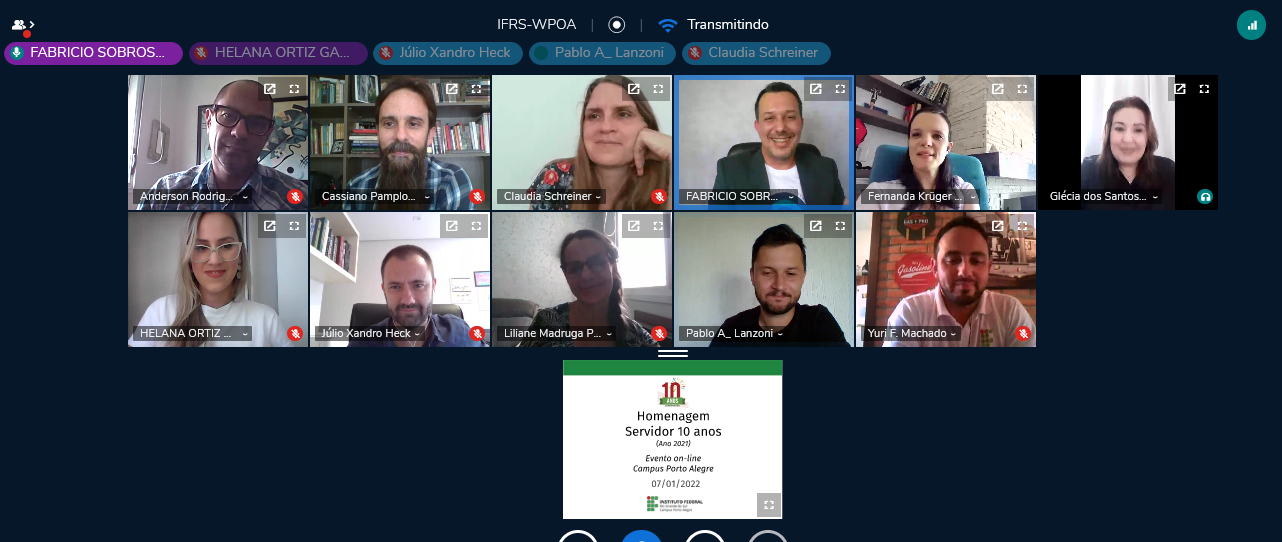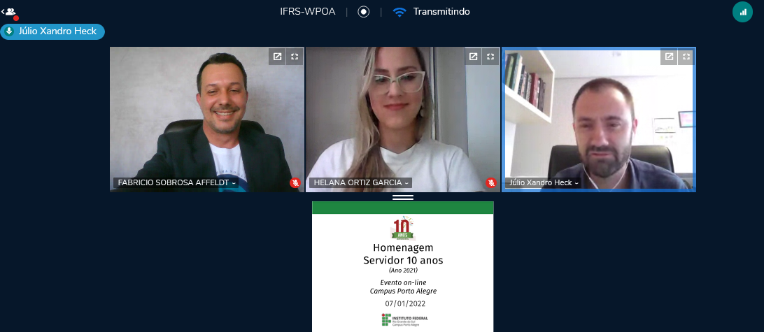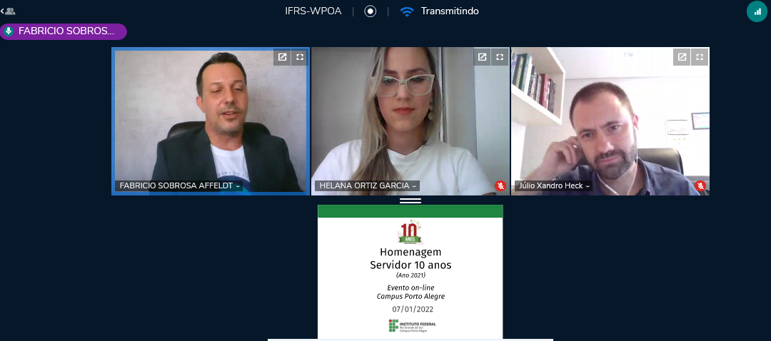O Campus Porto Alegre realizou na tarde desta sexta-feira, 07 de janeiro de 2022, de modo virtual, a edição 2021 do evento Servidor 10 anos IFRS, com o objetivo de homenagear os seus servidores com no mínimo 10 anos de efetivo exercício no serviço público federal e que hoje atuam no IFRS. Participaram da solenidade professores e técnicos-administrativos do campus.