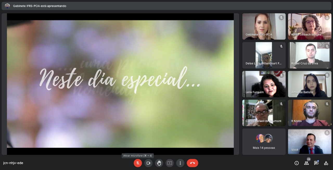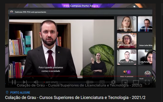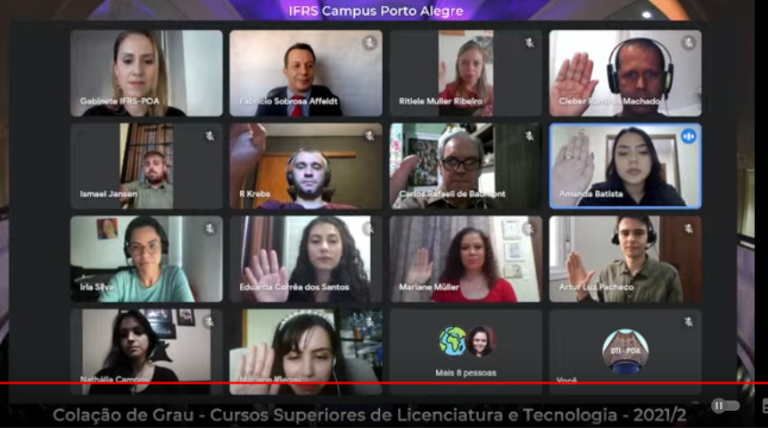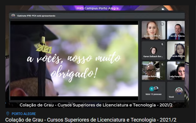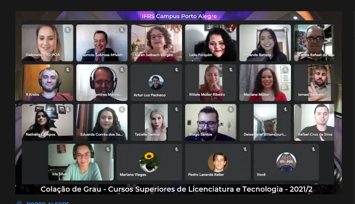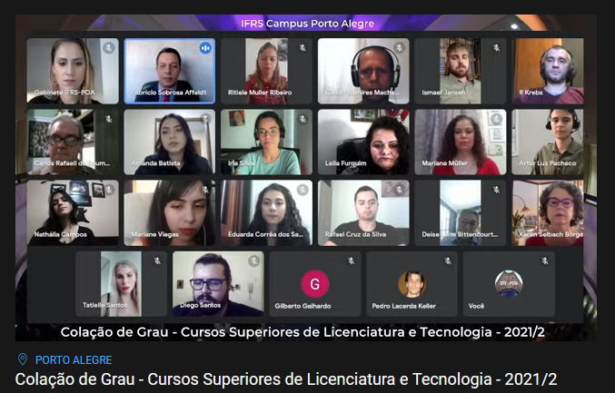 O IFRS - Campus Porto Alegre realizou na tarde de segunda-feira, 21 de março de 2022, mais uma Sessão Solene de Colação de Grau totalmente virtual. Na ocasião, colaram grau de forma remota, 16 estudantes concluintes do semestre 2021/2, dos cursos superiores de Licenciatura em Ciências da Natureza: Biologia e Química, Tecnologia em Gestão Ambiental, Tecnologia em Processos Gerenciais e Tecnologia em Sistemas para Internet.
