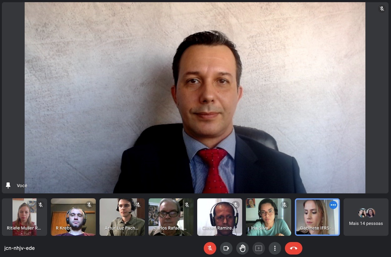 O evento ocorreu via web conferência através do Google Meet e foi transmitido ao vivo pelo canal do campus no YouTube (assista ao vídeo gravado). O ato foi conduzido pelo diretor-geral, professor Fabrício Sobrosa Affeldt, e pela chefe de gabinete do campus, Helana Ortiz Garcia, sendo acompanhado pelo representante da Coordenadoria de Registros Estudantis, servidor técnico-administrativo Pedro Lacerda Keller, e pelo diretor de Tecnologia da Informação, Evandro Miletto.