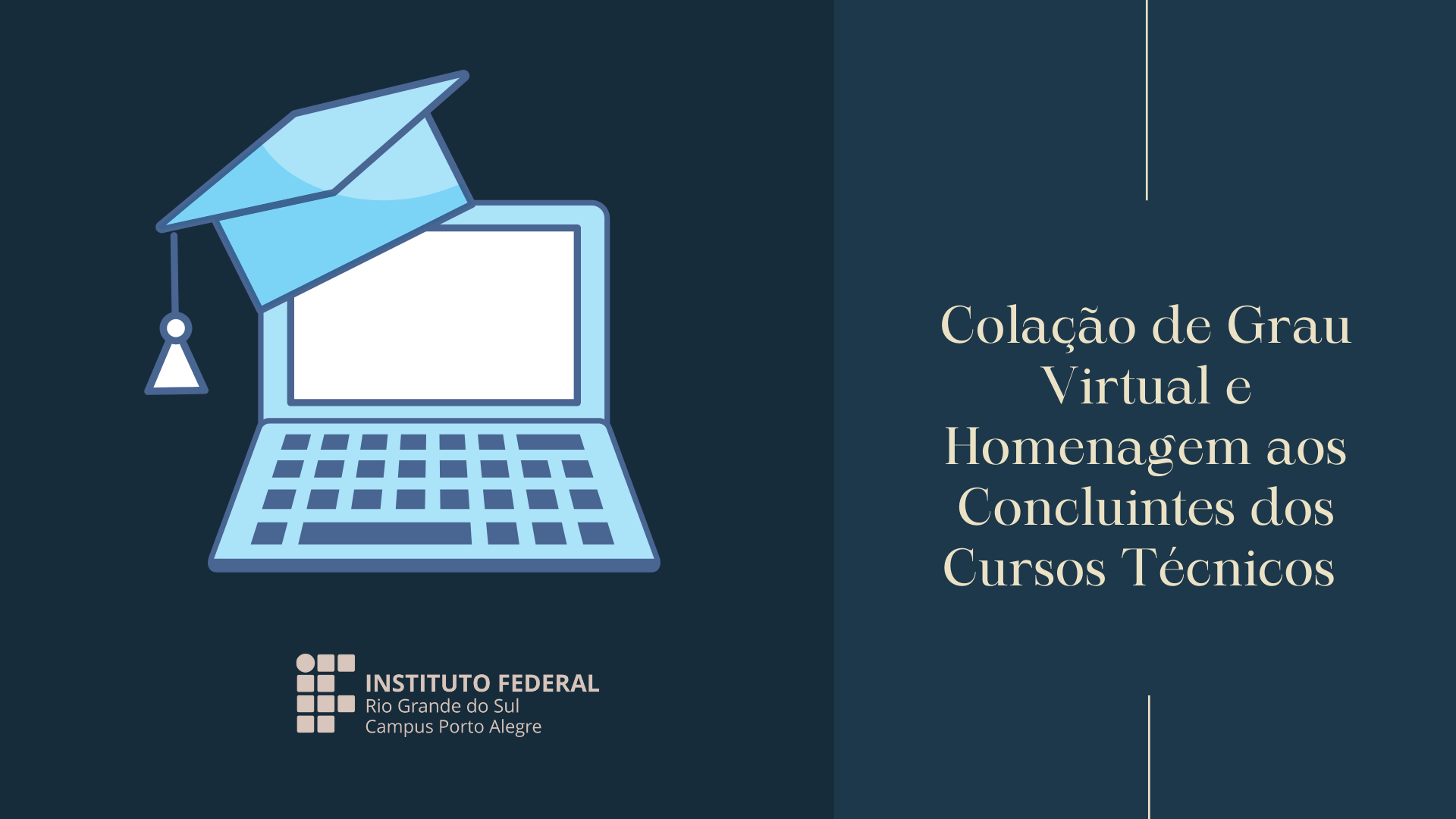 Nesta quinta-feira, dia 28 de outubro de 2021, às 14h30min, acontece mais uma cerimônia de colação de grau virtual do IFRS - Campus Porto Alegre. Participarão estudantes concluintes do semestre 2021/1 dos cursos superiores de Licenciatura em Ciências da Natureza, Tecnologia em Gestão Ambiental, Tecnologia em Processos Gerenciais e Tecnologia em Sistemas para Internet. A transmissão ao vivo poderá ser acompanhada pelo canal do Campus no YouTube.