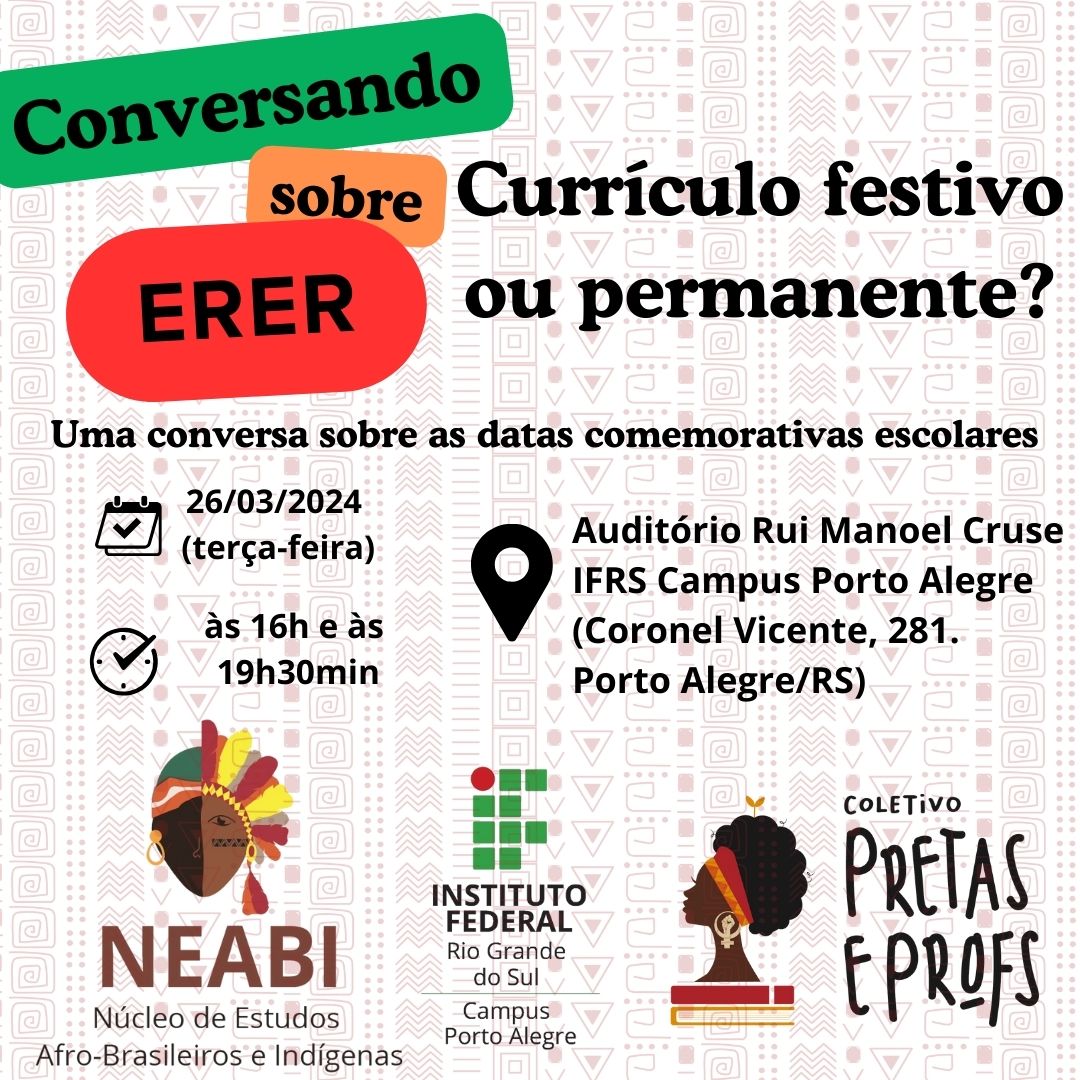 O NEABI do Campus Porto Alegre do IFRS, dentro da sua proposta de atividades voltadas para a formação, discussão e promoção da Educação das e para Relações Étnico-Raciais (ERER), dá início a uma série de encontros sobre o tema, intitulados "Conversando sobre ERER", que serão rodas de construção e debate sobre questões cotidianas ligadas à educação antirracista.