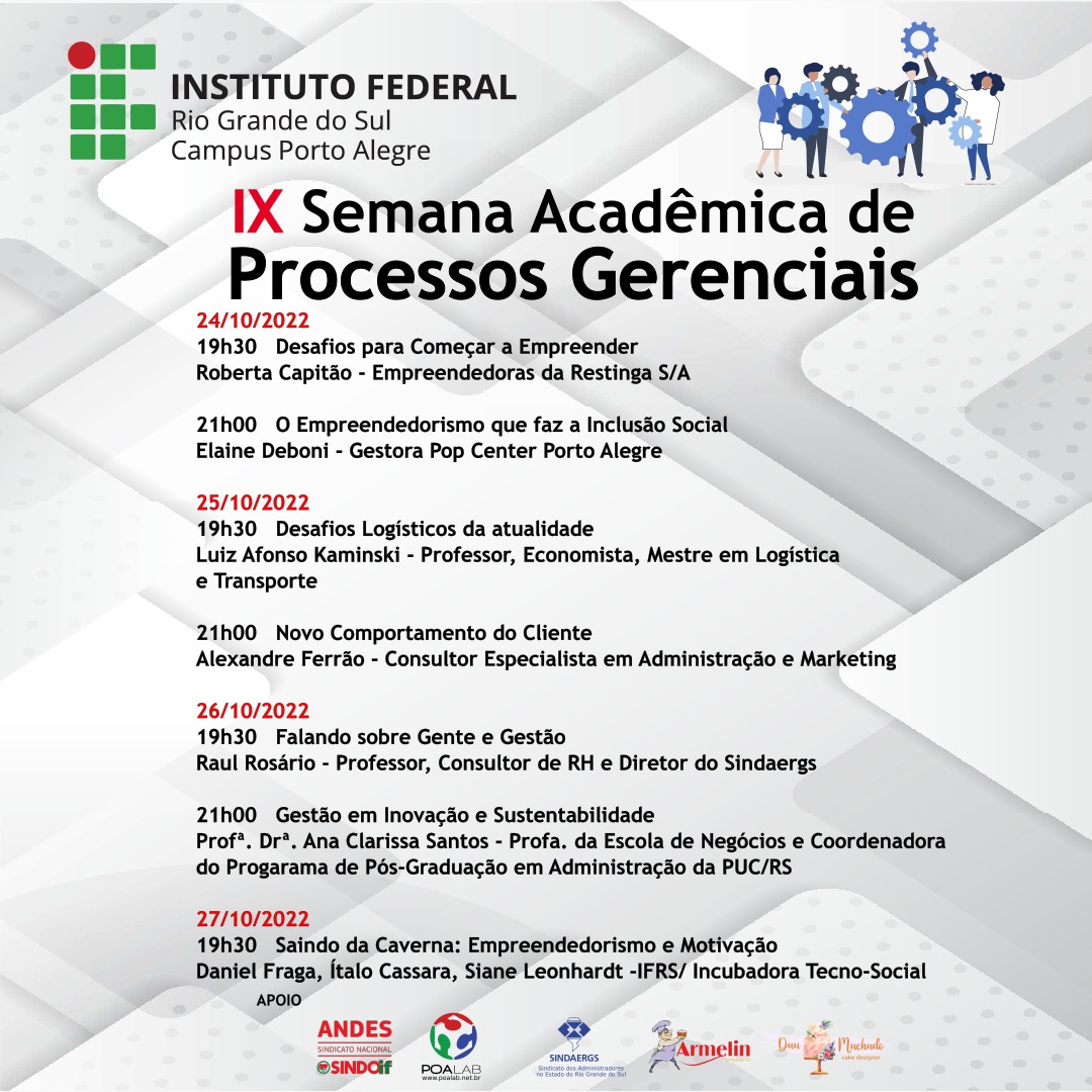 Acontece de 24 a 27 de outubro de 2022 a IX Semana Acadêmica do Curso Superior de Tecnologia em Processos Gerenciais, no Auditório da Torre Sul (sala 923), do IFRS - Campus Porto Alegre. O evento é organizado pelos alunos do curso com o apoio do colegiado do curso e da coordenadora, professora Deise Leite Bittencourt Friedrich.