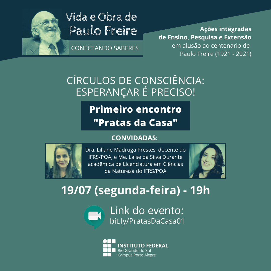 Acontece na segunda-feira, 19 de julho de 2021, às 19h, mais um encontro da ação Círculos de Consciência: Esperançar é preciso! A proposta desta vez é o primeiro encontro virtual com "pratas da casa", isto é, uma conversa sobre ações que estão sendo realizadas no Campus que abordam a vida e obra Paulo Freire. A atividade terá como convidadas a professora Dra. Liliane Madruga Prestes, do IFRS - Campus Porto Alegre, e Laíse da Silva Durante, acadêmica do curso de Licenciatura em Ciências da Natureza do Campus. O evento on-line será realizado através do Google Meet, pelo link meet.google.com/xbc-pkay-mco (aviso: número limitado de participantes). Em caso de necessidade de tradução e interpretação em Libras, entre em contato com a comissão até 16 de julho pelo e-mail anopaulofreire@poa.ifrs.edu.br.