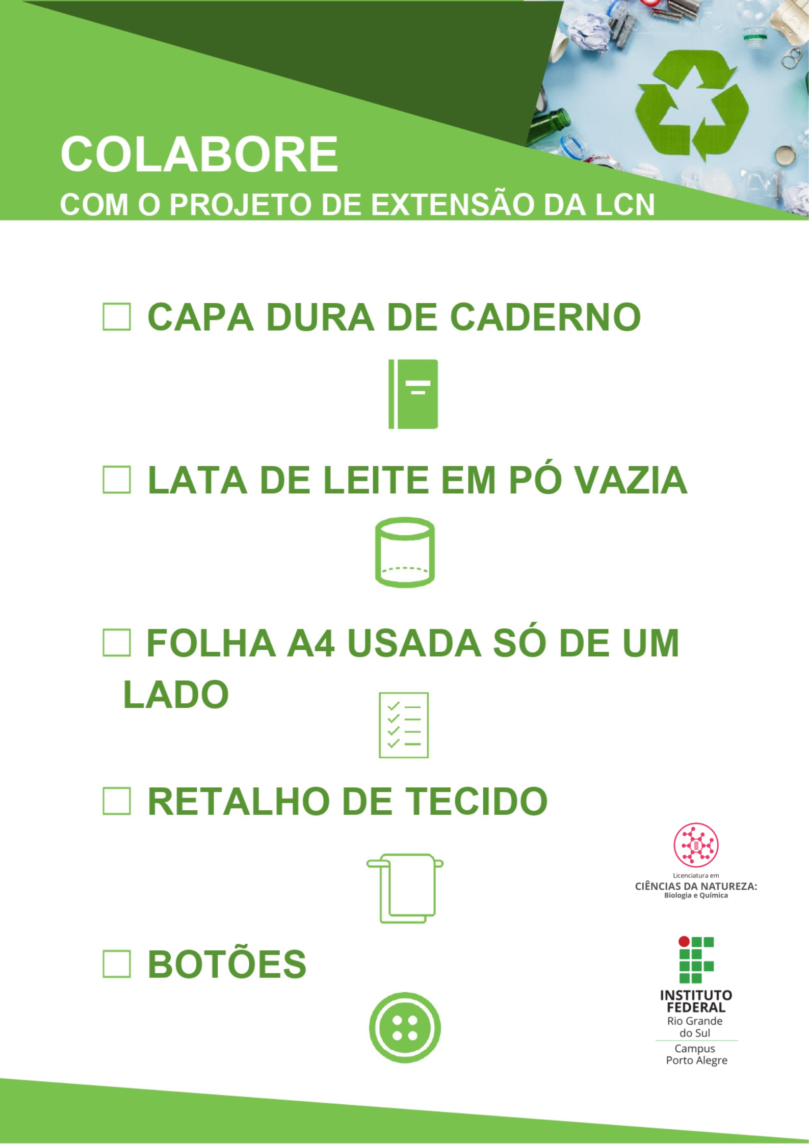 Você está aqui: Página inicial > Todas as notícias > Notícias Principais > Projeto do curso Licenciatura em Ciências da Natureza necessita colaboração na coleta de materiais reutilizáveis