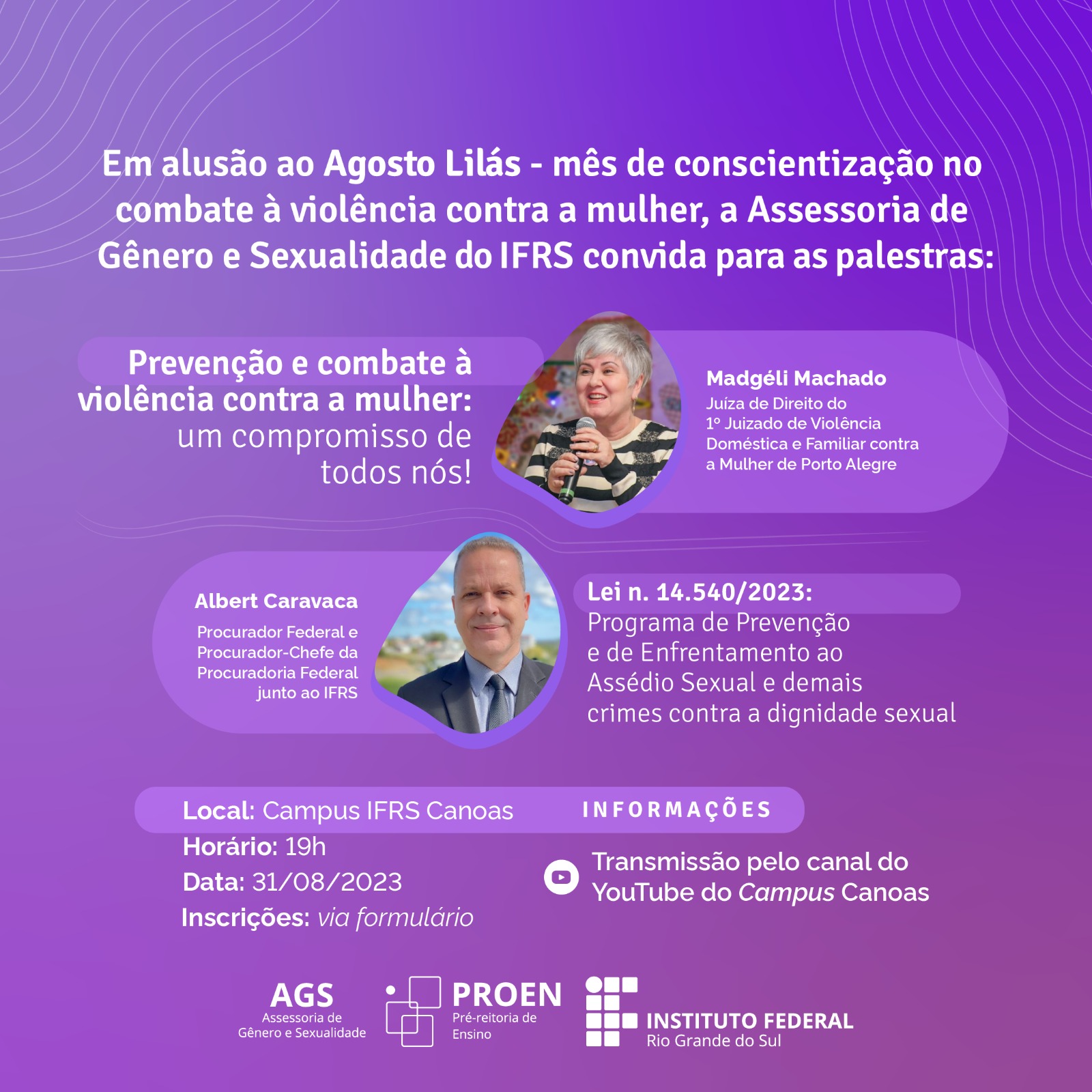 Em alusão ao Agosto Lilás, mês de conscientização pelo fim da violência contra a mulher, a Assessoria de Gênero e Sexualidade do IFRS promoverá uma noite de palestras na próxima quinta-feira, 31 de agosto de 2023. A atividade ocorrerá a partir das 19h, no auditório do Campus Canoas, com transmissão ao vivo no canal de YouTube do campus.