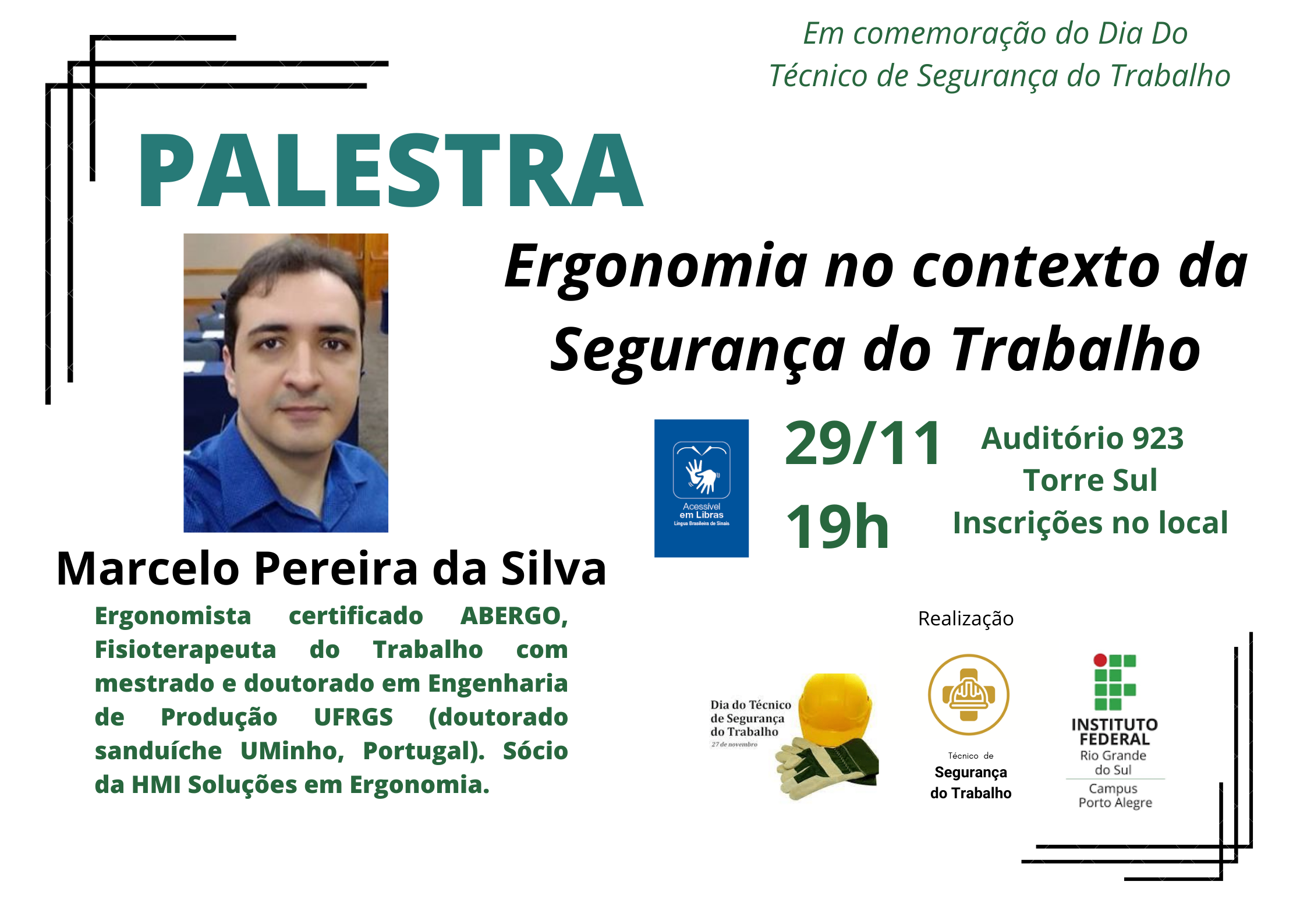 Em comemoração ao Dia do Técnico de Segurança do Trabalho, celebrado em 27 de novembro, o curso Técnico em Segurança do Trabalho do IFRS - Campus Porto Alegre promove no dia 29 de novembro de 2022, a palestra "Ergonomia no contexto da Seguranaça do Trabalho", às 19h, no auditório 923 da Torre Sul.