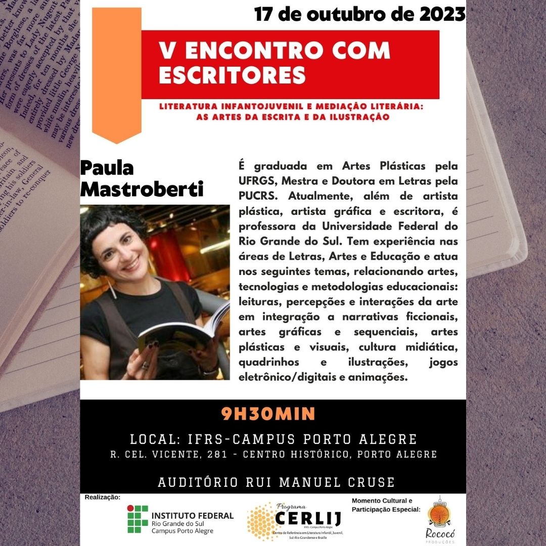 O evento, promovido pelo Curso Técnico em Biblioteconomia do IFRS-Campus POA objetiva dar continuidade a mais uma ação vinculada ao Projeto de Extensão CERLIJ: Leitura, Informação, Acessibilidade e Literatura ao realizar o V Encontro com Escritores: Literatura Infantojuvenil e Mediação Literária: as artes da escrita e da ilustração com Paula Mastroberti.