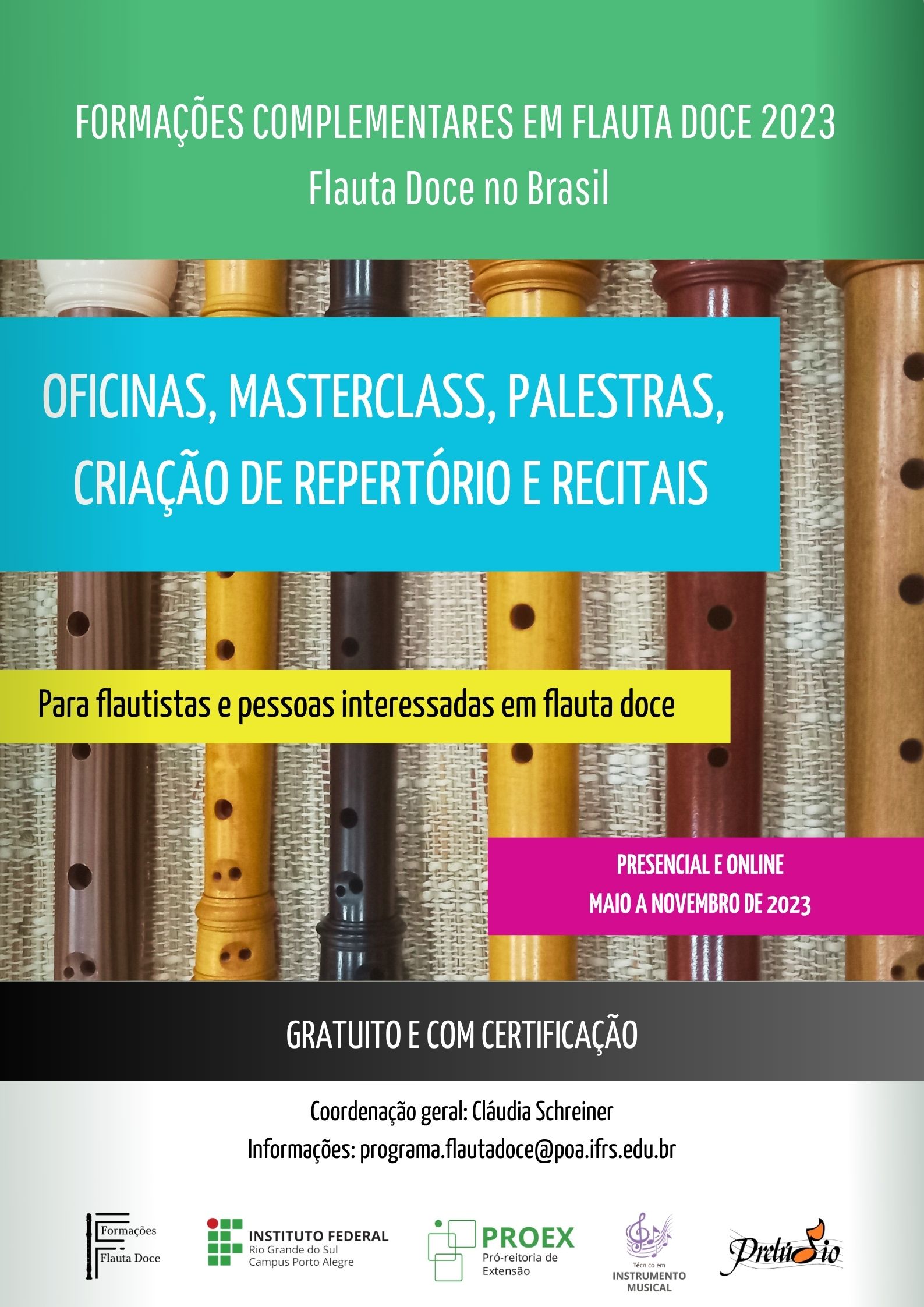Inicia nesta quinta-feira, 04 de maio, com Recital de Abertura às 19h, a segunda edição do programa de extensão Formações Complementares em Flauta Doce, uma série de eventos e atividades, todos gratuitos, relacionados à flauta doce, tendo por objetivo oferecer diferentes oportunidades de formação complementar no instrumento.
