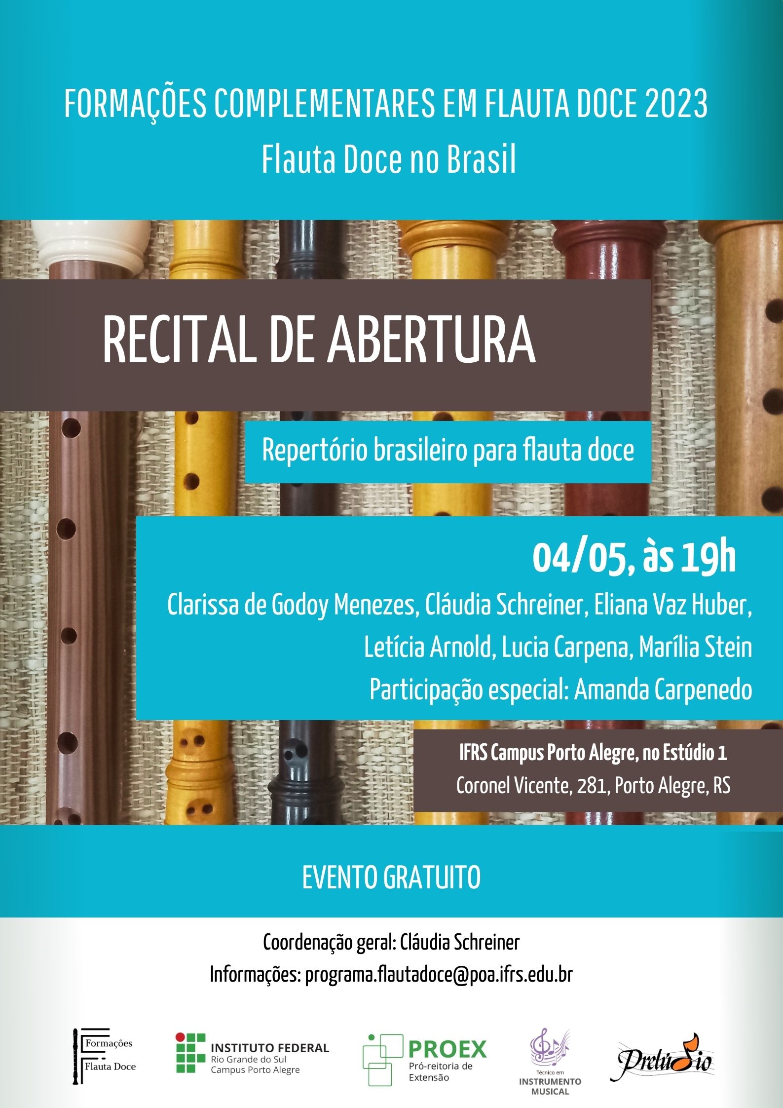 O Recital de Abertura ocorre no Estúdio 1 do Espaço Prelúdio e estará apresentando música brasileira original e arranjada para flautas doces, com a participação das flautistas Clarissa de Godoy Menezes e Cláudia Schreiner, docentes do Campus Porto Alegre, das flautistas convidadas Letícia Arnold, Lucia Carpena, Marília Stein e Eliana Vaz Huber e a participação especial da violonista Amanda Carpenedo.