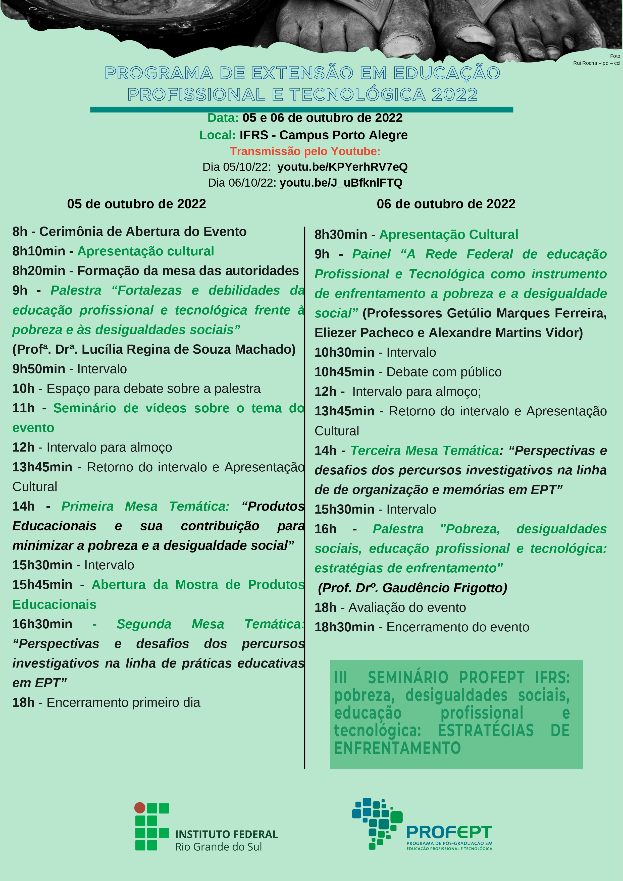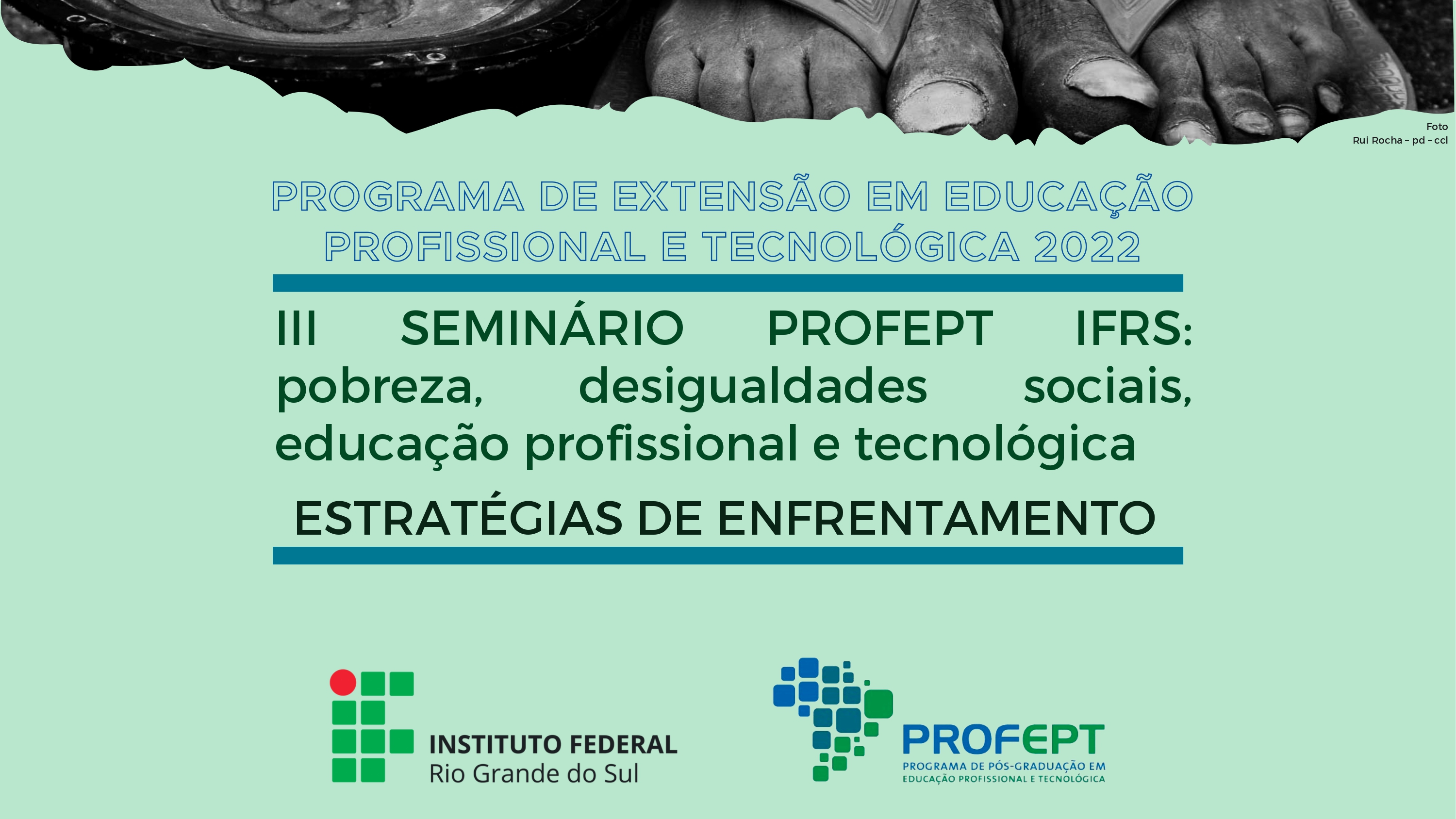 Será realizado nos dias 05 e 06 de outubro de 2022, o III Seminário ProfEPT IFRS - Pobreza, desigualdades sociais, educação profissional e tecnológica: estratégias de enfrentamento, promovido pelo Programa de Extensão em Educação Profissional e Tecnológica 2022, do IFRS - Campus Porto Alegre.