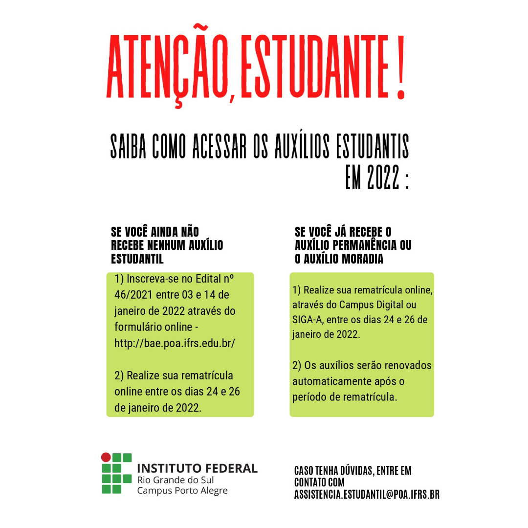 Estão abertas de segunda-feira, 03 de janeiro, até 14 de janeiro, sexta-feira, as inscrições da Etapa 1 do Programa de Auxílios de Assistência Estudantil - Edital nº 46/2021, para o período letivo de 2022. Esse período é destinado para inscrições de estudantes matriculados em 2021/2 que ainda não recebem o auxílio estudantil. As inscrições devem ser feitas nesta página: http://bae.poa.ifrs.edu.br/.