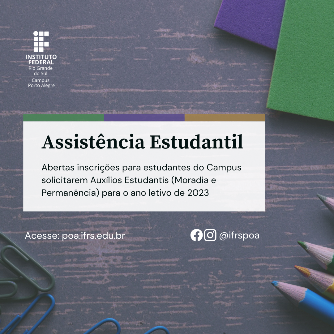 As inscrições são exclusivamente para estudantes do IFRS - Campus Porto Alegre que farão rematrícula para o semestre 2023/1, mas ainda não são vinculados ao Programa de Auxílios, e devem ser feitas nesta página: http://bae.poa.ifrs.