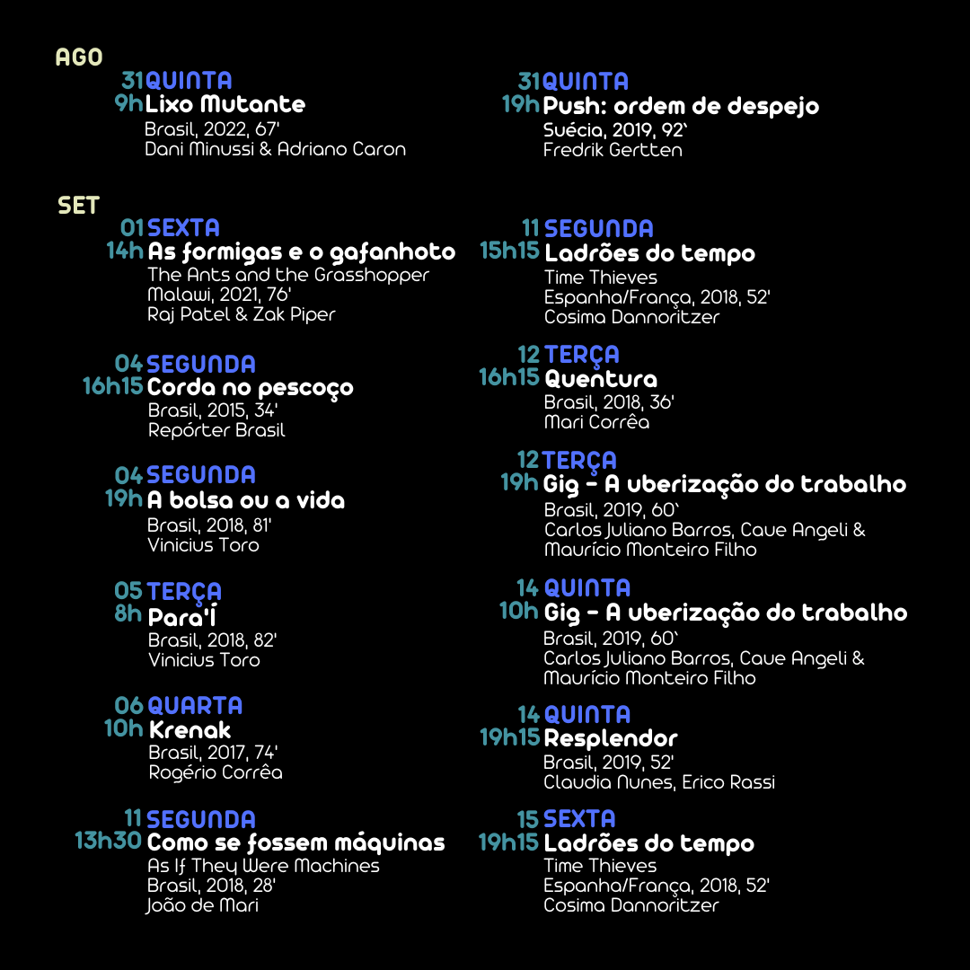 Acontece no IFRS - Campus Porto Alegre, a Mostra de Cinema Ambiental - 2ª edição, de 31 de agosto a 15 de setembro de 2023. A exibição de estreia terá o documentário Lixo Mutante (Brasil, 2022. Direção: Dani Minussi & Adriano Caron), na quinta-feira, 31/08, às 9h, no auditório Rui Cruse da Torre Norte do Campus Porto Alegre (R. Cel. Vicente, 281, Centro Histórico). O evento conta com o acervo da Ecofalante, tem sessões gratuitas e abertas ao público e certificação, mediante inscrição na hora.