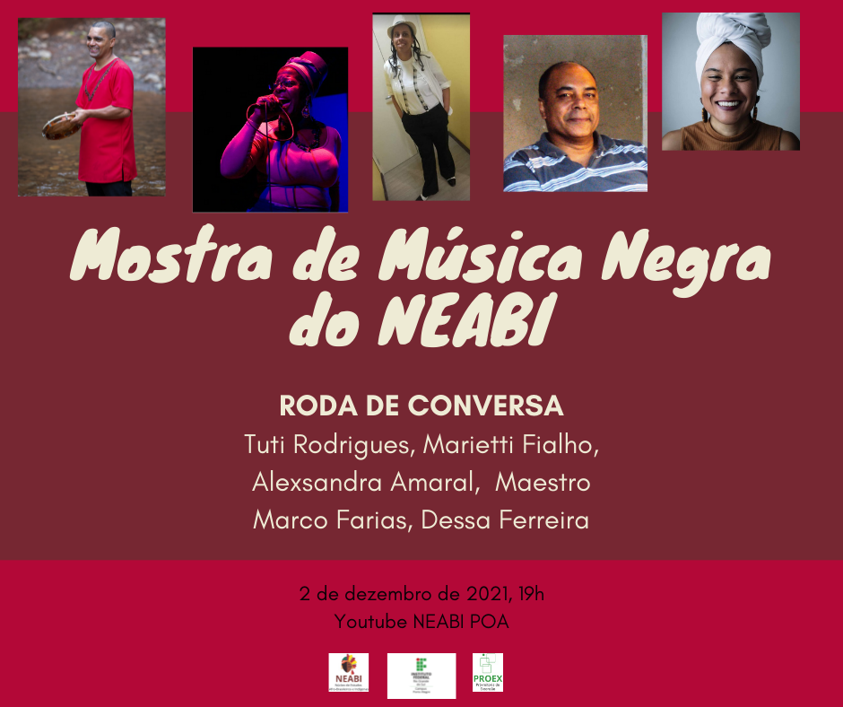 A primeira Mostra de Música Negra do Núcleo de Estudos Afro-Brasileiros e Indígenas (NEABI) do IFRS - Campus Porto Alegre, que teve início no dia 16 de novembro, encerra nesta quinta-feira, 2 de dezembro, às 19h, com uma Roda de Conversa virtual com os cinco artistas presentes na Mostra, : Tuti Rodrigues, Marietti Fialho, Alexsandra Amaral, Marco Farias e Dessa Ferreira. A mediação será de Pingo Borel, outro artista representativo da música negra e membro da equipe organizadora da mostra. A roda será transmitida no canal do NEABI IFRS-POA no YouTube.