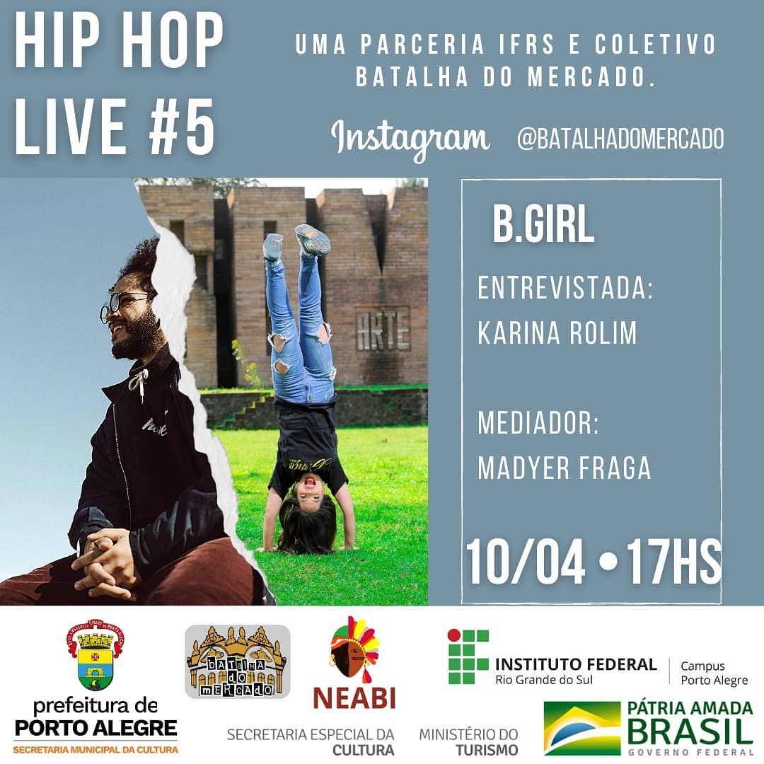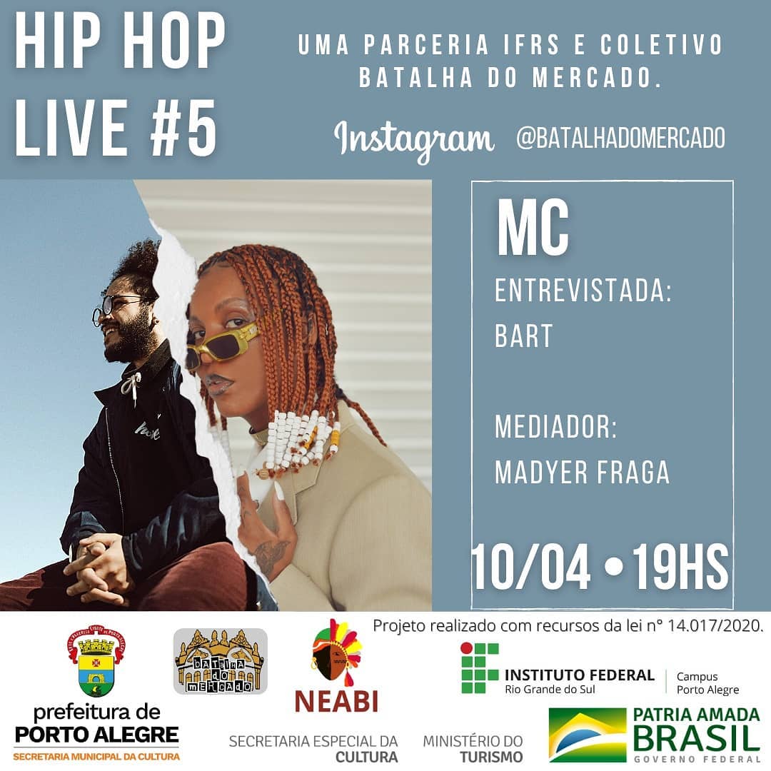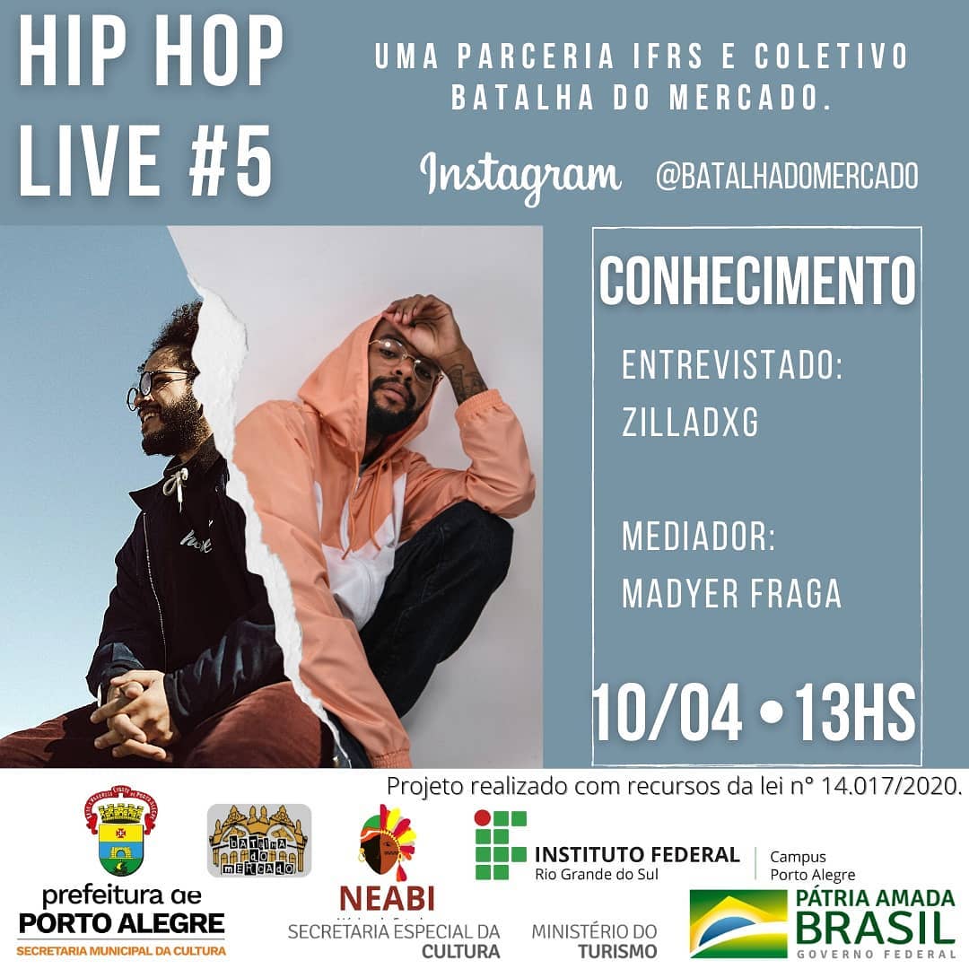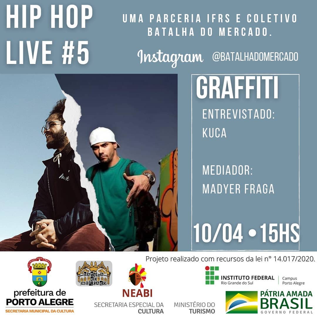 O Núcleo de Estudos Afro-Brasileiros e Indígenas (NEABI) do IFRS - Campus Porto Alegre e o Coletivo da Batalha do Mercado convidam para a live "Os 5 elementos do Hip Hop" que acontece no próximo sábado, 10 de abril de 2021, das 11h às 19h. O evento será transmitido pelo Instagram da Batalha do Mercado (@batalhadomercado). A série de lives será durante o dia, como um festival, todas sobre o Hip Hop. A ideia do evento é falar mais sobre cada elemento que está inserido nessa cultura.
