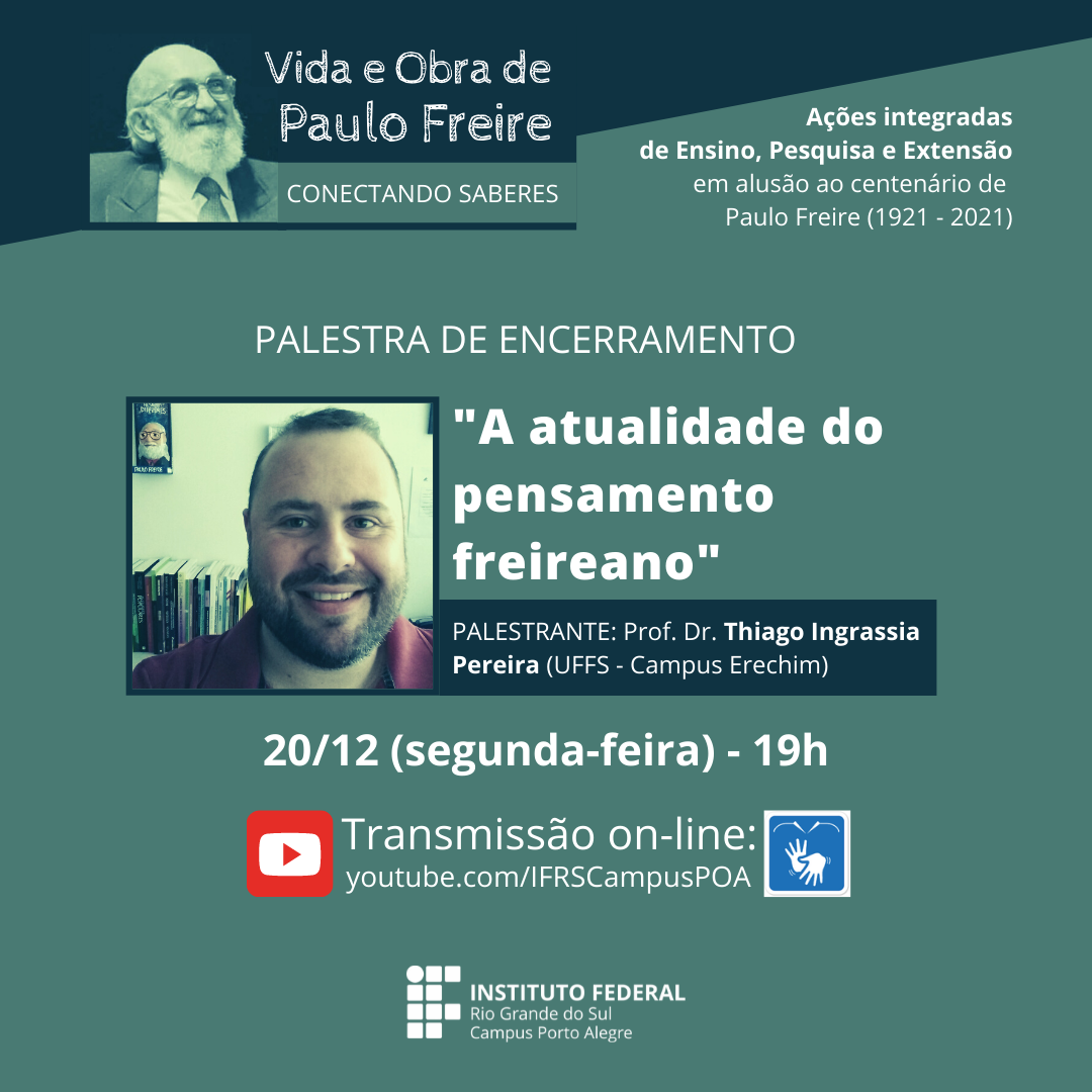 O Campus Porto Alegre do IFRS realiza na segunda-feira, 20 de dezembro de 2021, às 19h, a palestra intitulada "A atualidade do pensamento freireano", ministrada pelo professor Dr. Thiago Ingrassia Pereira, da Universidade Federal da Fronteira Sul (UFFS), Campus Erechim. O evento será transmitido on-line pelo canal do Campus Porto Alegre no YouTube, com acesso aberto a todos os interessados e acessível em Libras. A atividade marca o encerramento da série de ações integradas de Ensino, Pesquisa e Extensão do IFRS - Campus Porto Alegre com a temática Vida e Obra de Paulo Freire - Conectando Saberes, em alusão ao centenário do educador brasileiro, celebrado neste ano.