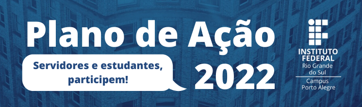 Para isso, convidamos toda a comunidade do IFRS – Campus Porto Alegre a participar, acessando o site: https://sites.google.com/poa.ifrs.edu.br/planodeacao2022/home. No endereço, é possível acessar um formulário para envio de propostas de ações, cujo prazo vai até 30 de julho de 2021. foi prorrogado até dia 04 de agosto.