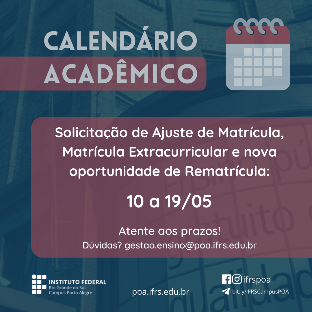 Dúvidas e mais informações sobre o processo de ajuste e rematrículas podem ser obtidas junto à Coordenadoria de Gestão de Ensino pelo e-mail: gestao.ensino@poa.ifrs.edu.br ou com a Coordenadoria de Registros Estudantis: registros.estudantis@poa.ifrs.edu.br.