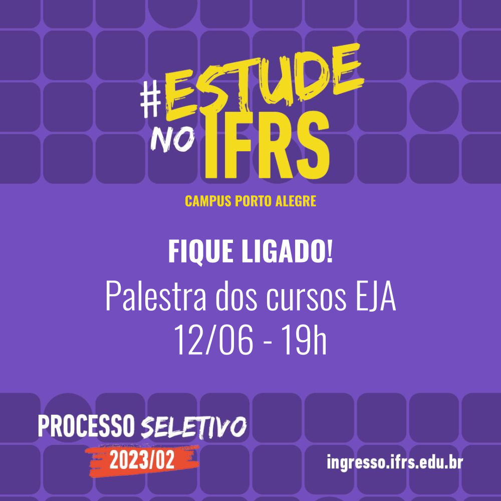 Você está aqui: Página inicial > Todas as notícias > Notícias Principais > Processo Seletivo 2023/2: palestra do curso EJA no Campus Porto Alegre será na segunda-feira, 12/06, às 19h