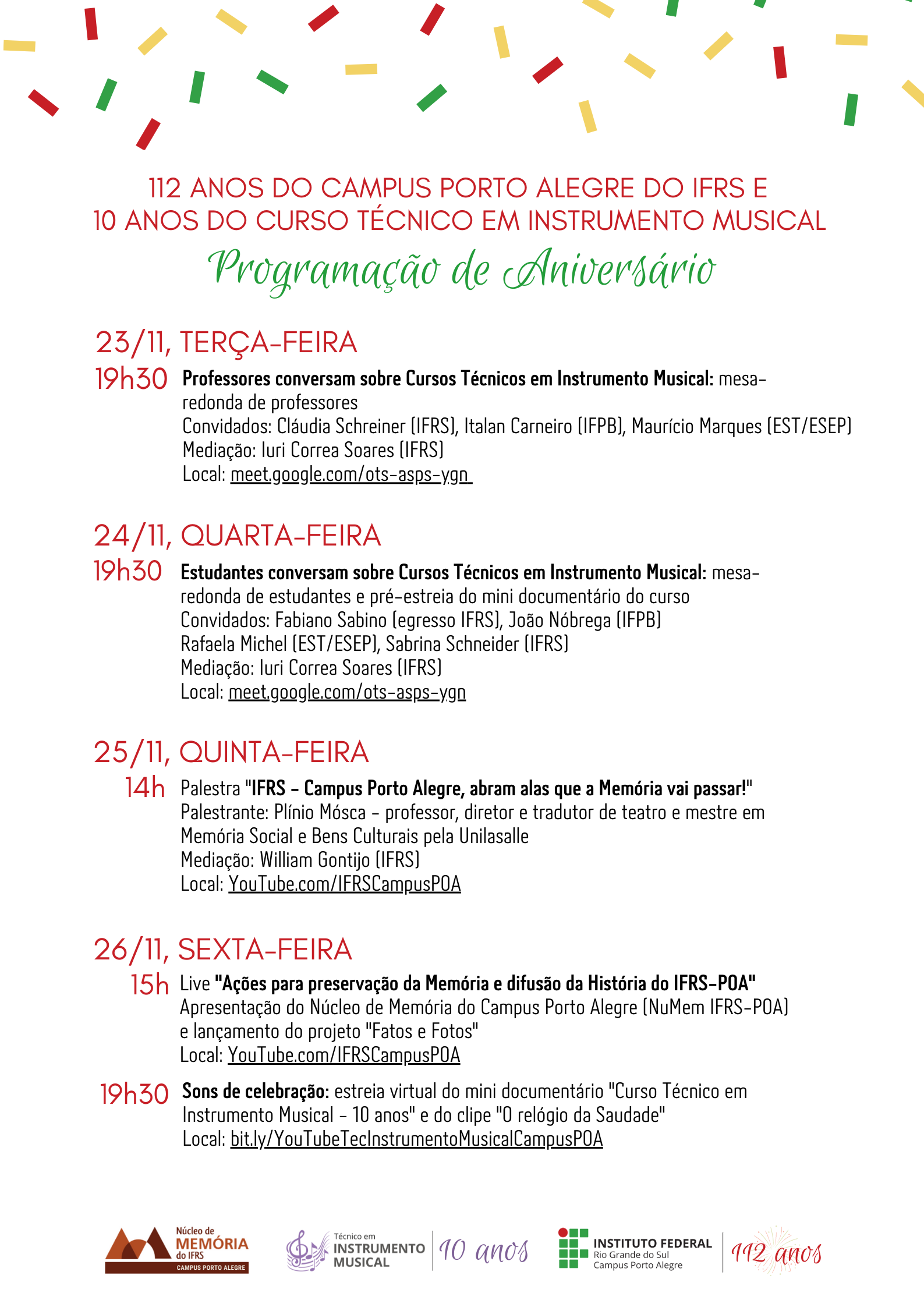 PROGRAMAÇÃO COMEMORATIVA - ANIVERSÁRIO 112 ANOS DO CAMPUS PORTO ALEGRE E 10 ANOS DO CURSO TÉCNICO EM INSTRUMENTO MUSICAL