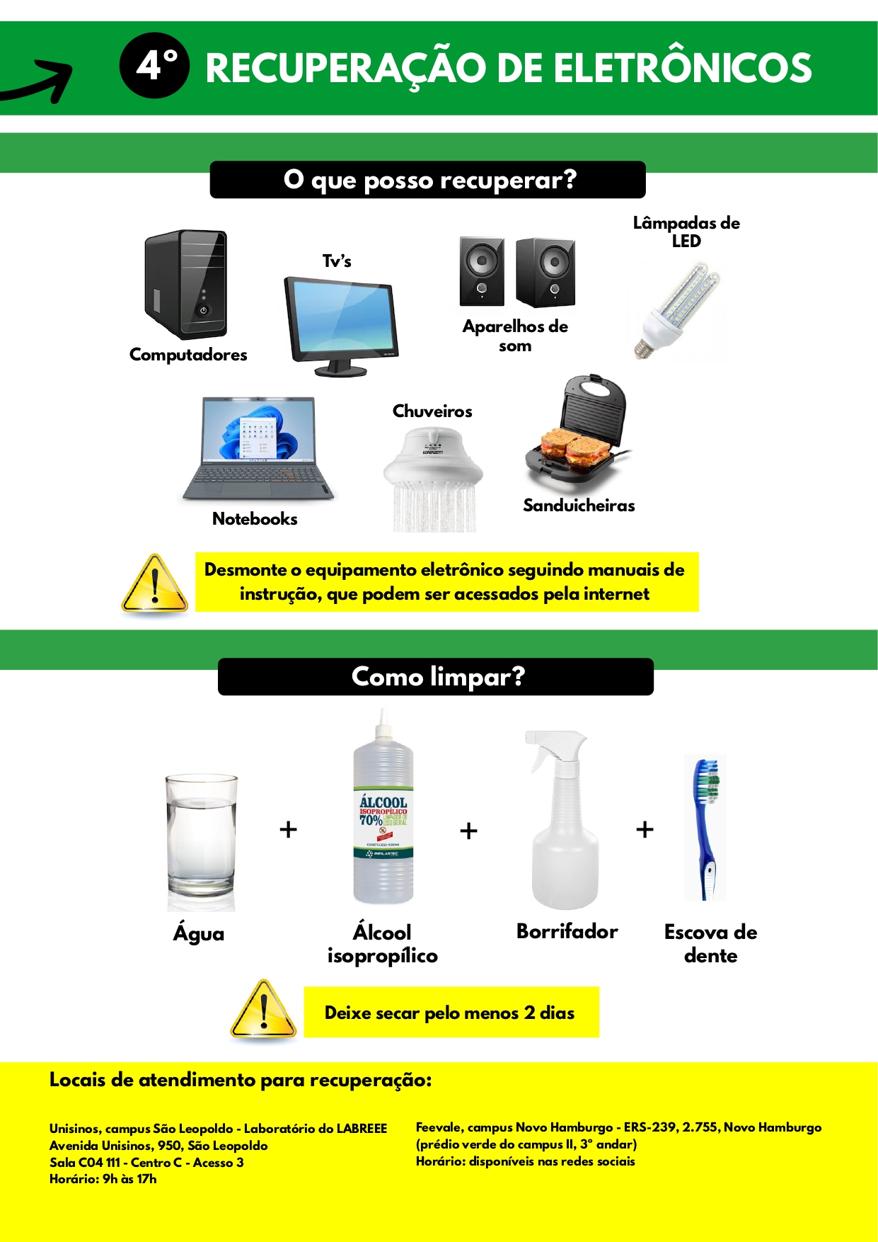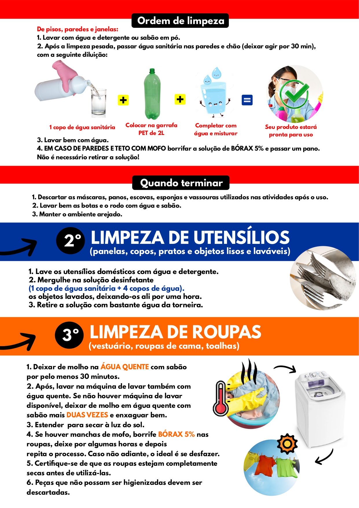 Além dos kits, o grupo compilou informações e elaborou um material informativo (abaixo) com orientações básicas, de forma esquematizada e fácil leitura, para auxiliar no passo a passo da limpeza das casas e higienização de utensílios, roupas e eletrônicos e alertas relativos à saúde. Parte deste material informativo foi impresso e plastificado e consta também no kit de limpeza.