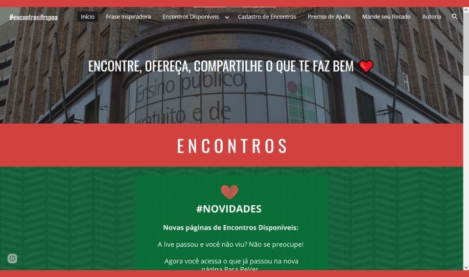 Em todo sentir já se exercita um sentido"1 e, para nós, foi bom enquanto durou! O projeto "Encontros – Encontre, ofereça, compartilhe o que te faz bem! “, uma das ações promovidas pelo IFRS - Campus Porto Alegre na intenção de manter a nossa comunidade conectada neste período de distanciamento social forçado pela pandemia de covid-19, fechou seu ciclo.