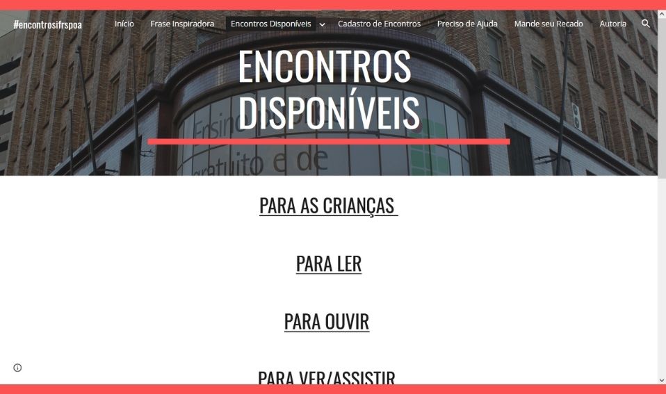 No ar desde 27 de abril de 2020, o #enconstrosifrspoa registrou e reuniu ações indicadas pelas comunidades interna e externa do campus, durante a quarentena, através do endereço eletrônico: https://sites.google.com/poa.ifrs.edu.br/encontros. Num momento de restrições quanto a encontros presenciais, essa iniciativa tinha como proposta central divulgar o que cada um estivesse fazendo - ou lendo, vendo, ouvindo, seguindo - para se sentir bem e que pudesse compartilhar, virtualmente, deixando outra pessoa bem, também.