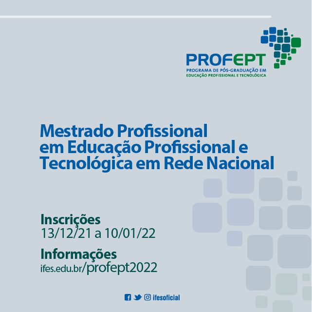 As inscrições para o mestrado ProfEPT vão de 13 de dezembro deste ano até o dia 10 de janeiro de 2022.