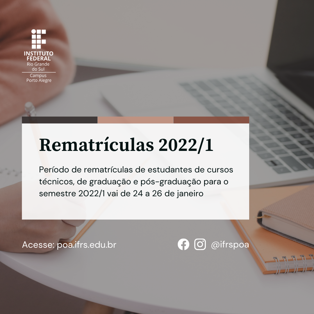 As rematrículas para o semestre 2022/1 serão realizadas no período de 24 a 26 de janeiro de 2022 e devem ser feitas on-line, por meio dos respectivos sistemas acadêmicos - Campus Digital e Portal do Aluno do SIGAA. A rematrícula é necessária para estudantes dos cursos técnicos, de graduação e pós-graduação que estavam matriculado em 2021/2.