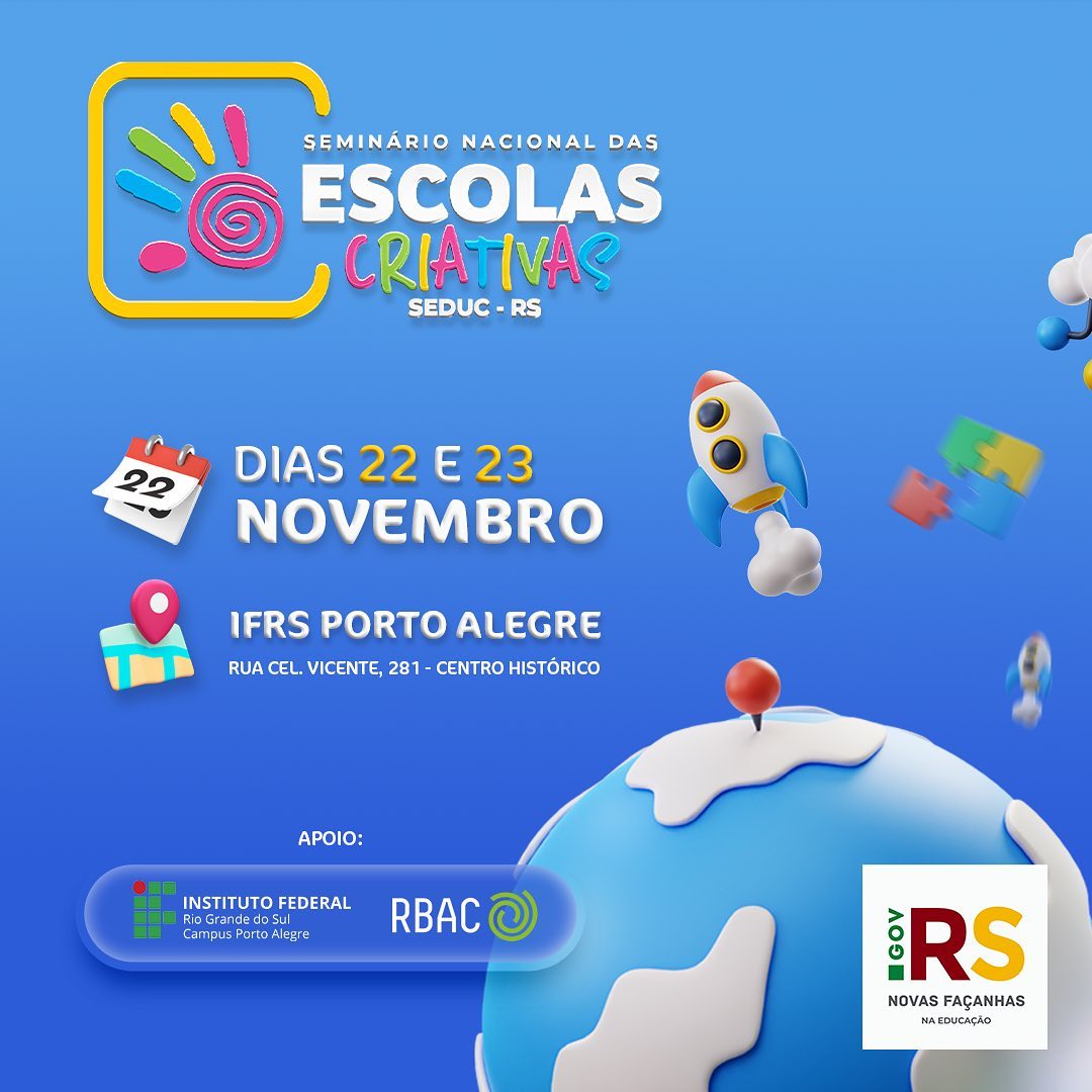 A Secretaria Estadual da Educação do Rio Grande do Sul (Seduc) realiza, nos dias 22 e 23 de novembro, o Seminário Nacional das Escolas Criativas, no Instituto Federal do Rio Grande do Sul - Campus Porto Alegre (IFRS/POA). O evento, que ocorre das 9h30 às 17h, nos dois dias, contará com painelistas nacionais e internacionais e celebrará os resultados do Programa Escolas Criativas, implementado em uma parceria entre a Seduc e a Rede Brasileira de Aprendizagem Criativa (RBAC). Acontece, também, na ocasião, o Festival de Invenção e Criatividade (FIC), onde serão exibidos mais de 30 projetos da rede estadual de ensino no festival organizado pela RBAC.