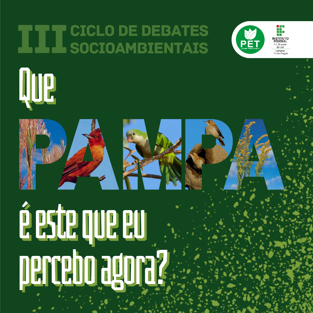 Dando continuidade ao seu III Ciclo de Debates Socioambientais "Que Pampa é este que eu percebo agora?", o grupo do Programa de Educação Tutorial (PET) Conexões - Gestão Ambiental, do IFRS - Campus Porto Alegre, convida toda a comunidade do IFRS para participar do segundo encontro deste evento que aborda a biodiversidade do bioma Pampa, predominante no estado do Rio Grande do Sul.