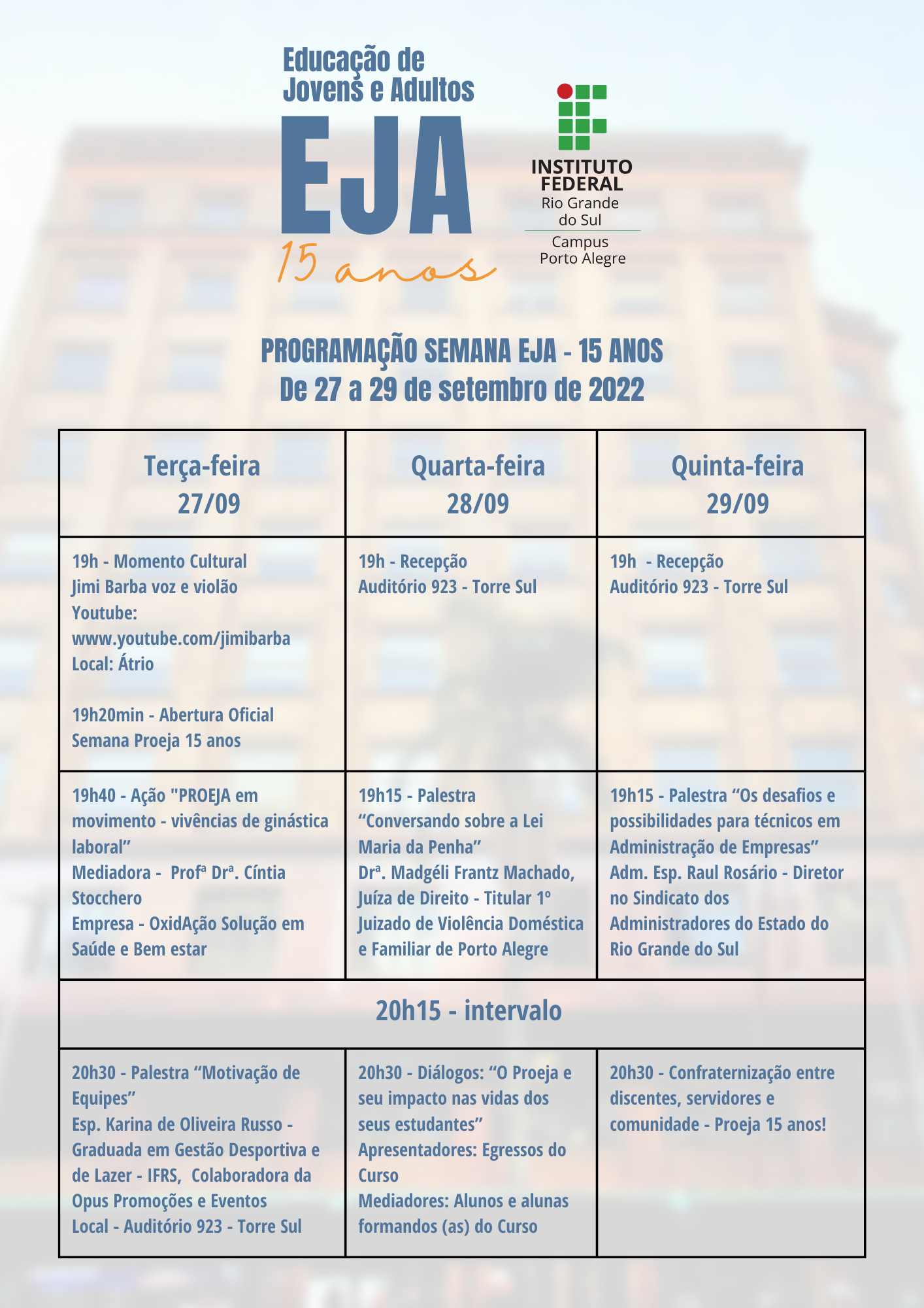 A modalidade Educação de Jovens e Adultos (EJA) está completando 15 anos de existência no IFRS - Campus Porto Alegre e, para marcar a data, o curso organizou uma programação especial, que acontece entre os dias 27 e 29 de setembro de 2022.