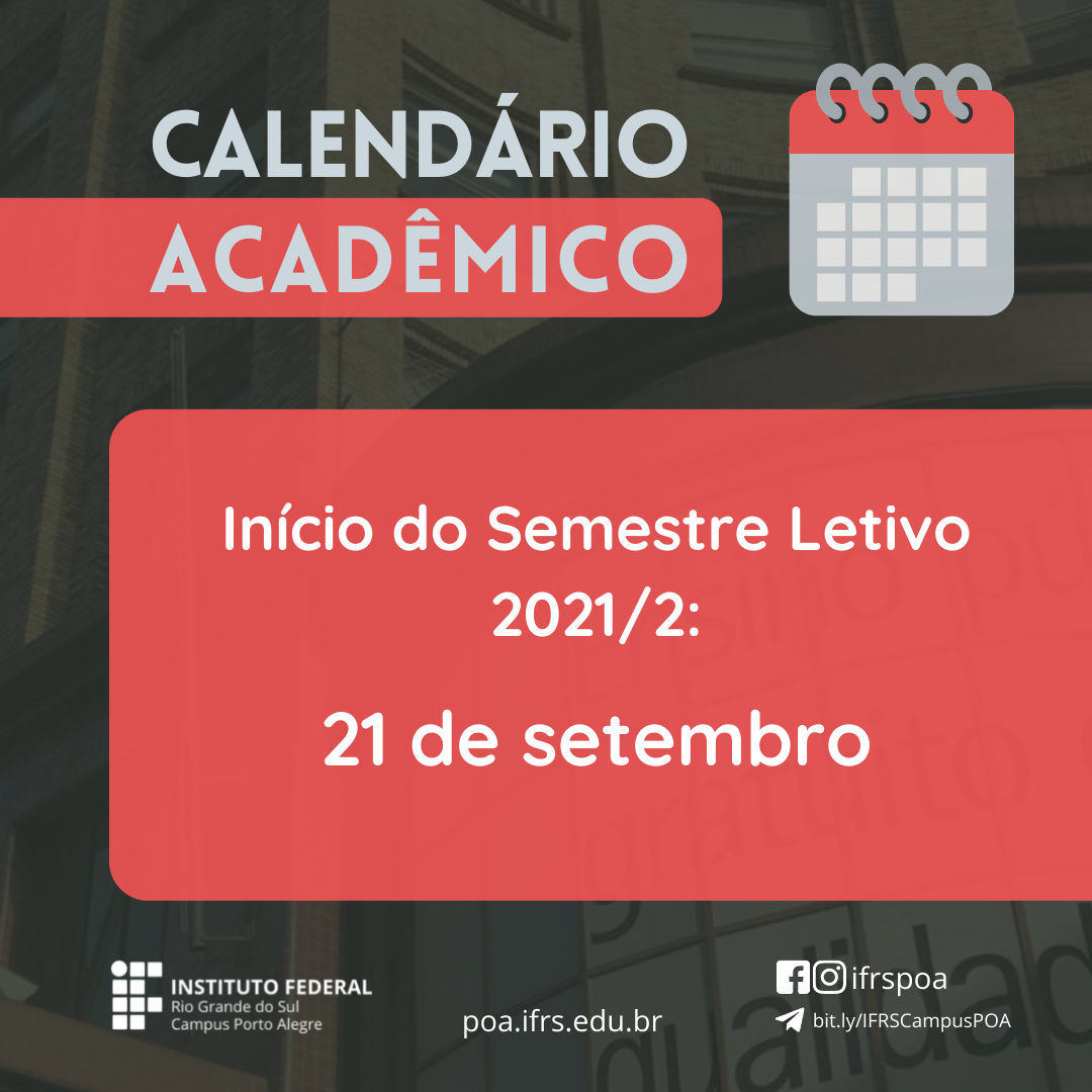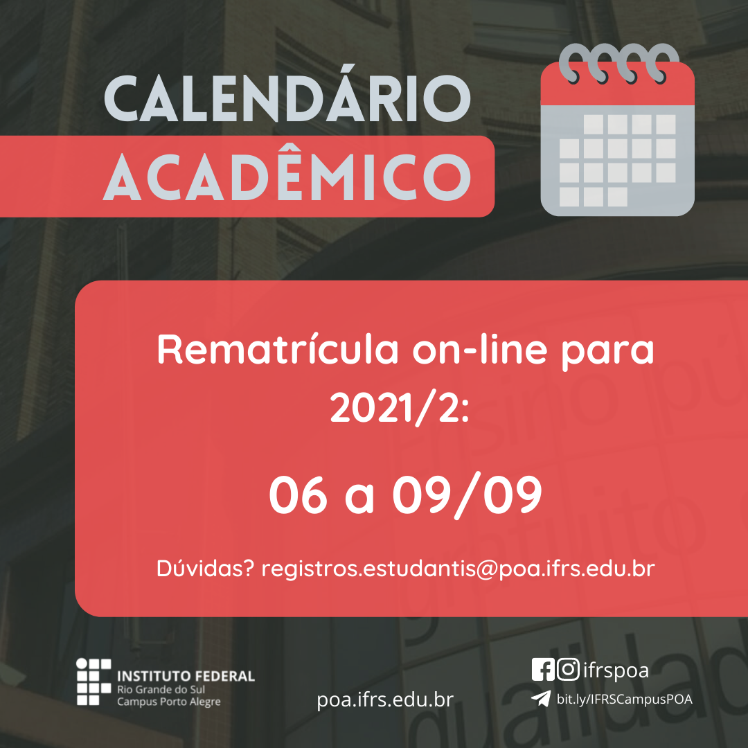 De acordo com o calendário acadêmico, as rematrículas on-line de quem já é aluno do Campus serão feitas de 06 a 09/09, e o Campus Porto Alegre dará início ao segundo semestre letivo de 2021 no dia 21/09.