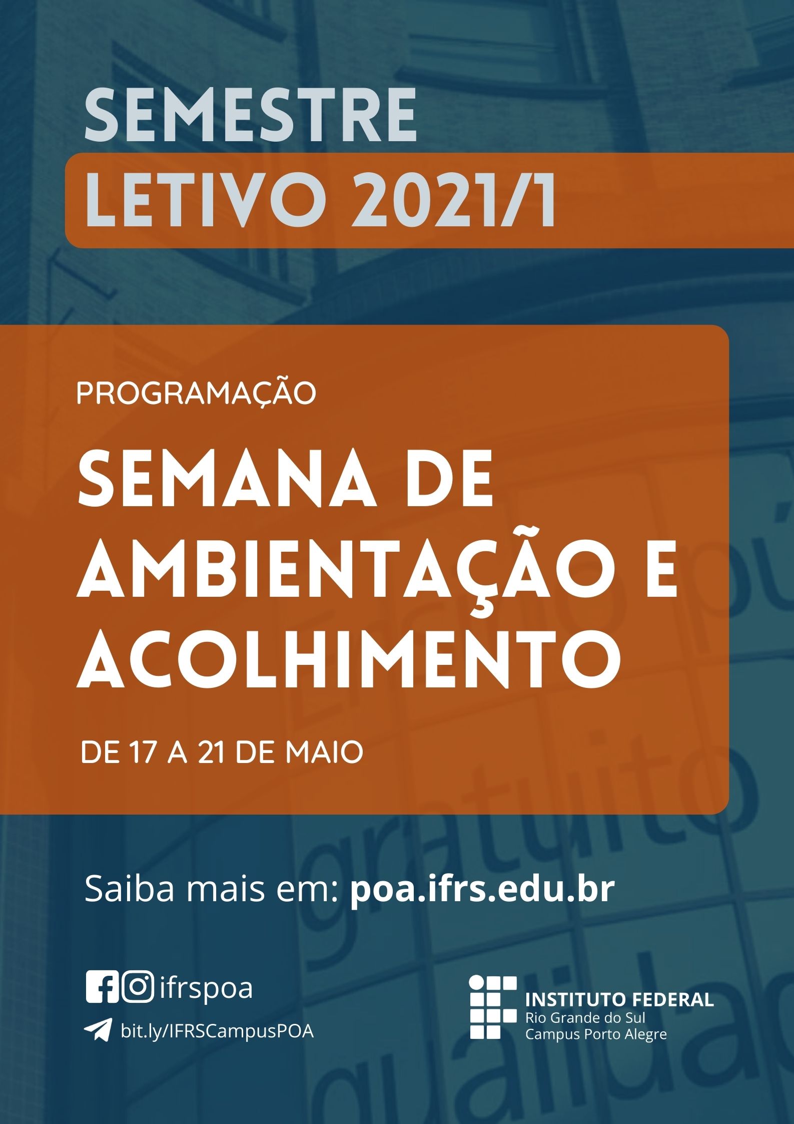 Inicia na próxima segunda-feira, 17 de maio, no formato de ensino remoto, o semestre letivo 2021/1 do IFRS - Campus Porto Alegre. Conforme previsto no Calendário Acadêmico 2020/2021, para a primeira semana do semestre, está programada uma série de atividades virtuais de ambientação e acolhimento destinadas à comunidade acadêmica - estudantes e servidores do campus.