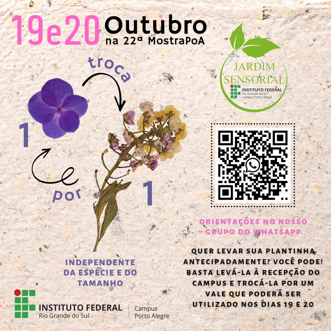O projeto de extensão Jardim Sensorial: (re)-conectando os sentidos realizará uma ação de troca de mudas de plantas nos dias 19 e 20 de outubro, às 15h, integrando a programação da 22ª edição da Mostra de Pesquisa, Ensino e Extensão do IFRS - Campus Porto Alegre - 22ª MostraPoA.