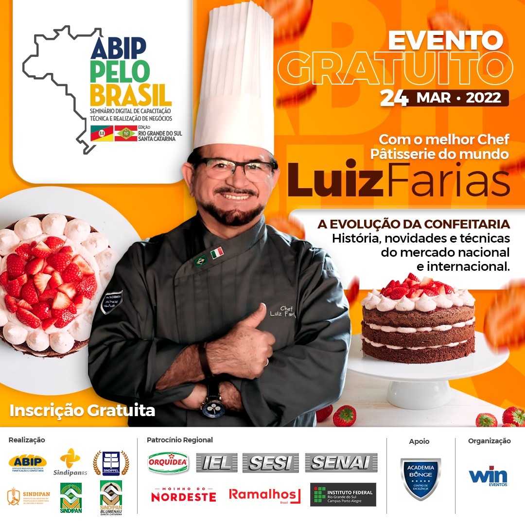 Acontece no dia 24 de março, das 14h às 20h, de modo virtual, a edição Rio Grande do Sul e Santa Catarina do SEMINÁRIO ABIP PELO BRASIL, criado pela Associação Brasileira da Indústria de Panificação e Confeitaria – ABIP. O IFRS - Campus Porto Alegre, por meio do curso Técnico em Panificação, é uma das instituições apoiadoras desse evento, que busca propor soluções em meio a essa pandemia que estamos vivendo, abrangendo e integrando duas áreas de extrema relevância neste período: capacitação técnica para as empresas e profissionais através de palestras, cursos e aulas shows; e a realização de negócios através da “feira digital” que acontece simultaneamente. A feira contará com um estande virtual do IFRS - Campus Porto Alegre. As inscrições são gratuitas e podem ser feitas no site do evento.