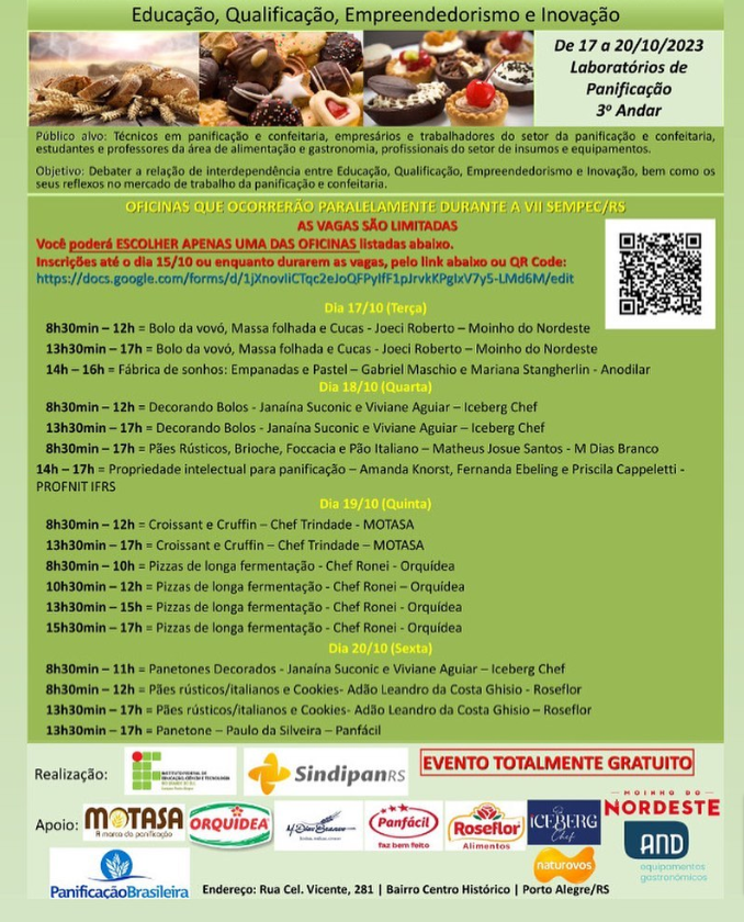 Durante a semana de 16 a 20 de outubro, o Instituto Federal de Educação, Ciência e Tecnologia do Rio Grande do Sul (IFRS) de Porto Alegre sedia a Vll Semana da Panificação e Confeitaria do RS - V SEMPEC/RS. O evento tem como foco a educação, qualificação, empreendedorismo e inovação no setor da panificação e confeitaria.