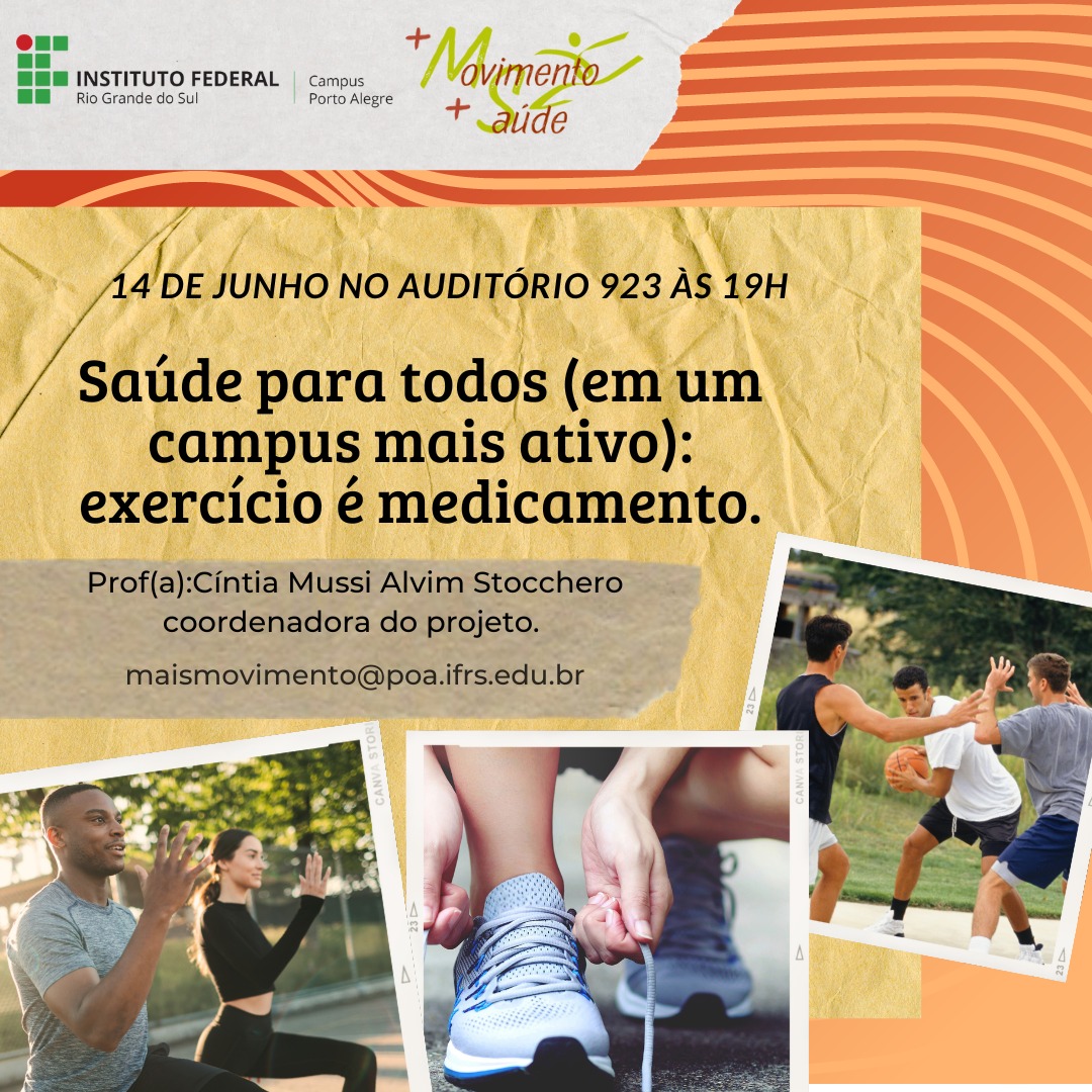 O Grupo de Trabalho (GT) Esporte, Saúde e Lazer e o projeto "Mais Movimento, Mais Saúde", do IFRS - Campus Porto Alegre, convidam a comunidade acadêmica para a palestra "Saúde para...