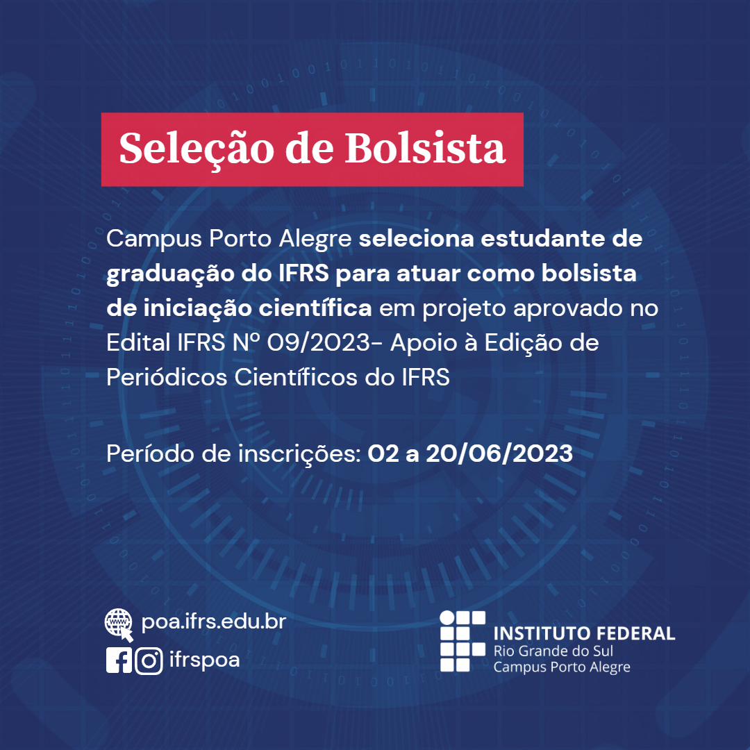 Foi publicado no dia 28 de junho de 2023 o Resultado Final do Edital Campus Porto Alegre nº 19/2023 para seleção de bolsista na modalidade de Iniciação Científica (BICT) ...
