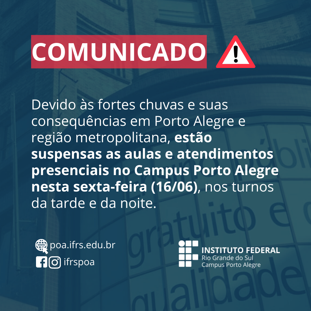 Comunidade Acadêmica do Campus Porto Alegre, Comunicamos a suspensão das atividades letivas em 16 de junho de 2023 em razão das fortes chuvas e das suas consequências em Porto Alegre e...